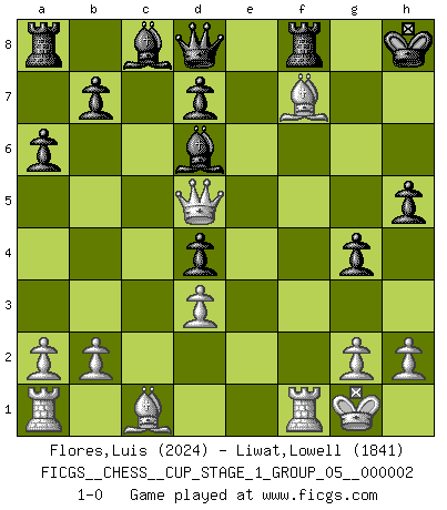 Last move : 1-0 2018 July 7 2:20:13 [Event "FICGS__CHESS__CUP_STAGE_1_GROUP_05__000002"] [Site "FICGS"] [Date "2018.07.02"] [Round "1"] [White "Flores,Luis"] [Black "Liwat,Lowell"] [Result "1-0"] [WhiteElo "2024"] [BlackElo "1841"] 1.e4 c5 2.Nf3 Nc6 3.Bb5 e5 4.O-O Nd4 5.Nxd4 cxd4 6.d3 g5 7.c3 Bc5 8.Nd2 a6 9.Bc4 h5 10.Qb3 Nh6 11.cxd4 exd4 12.e5 O-O 13.Ne4 Be7 14.f4 g4 15.f5 Nxf5 16.Nd6 Nxd6 17.exd6 Bxd6 18.Bxf7+ Kh8 19.Qd5 1-0 Sicilian : Nimzovich-Rossolimo attack (without ...d6) Kingside Castling by player White (move 4) Kingside Castling by player Black (move 12) Player White won this chess game. Follow this game move after move (download)Discovered check is the dive bomber of the Chessboard. (Reuben Fine) Ich habe die besten Aussichten, den ersten Preis zu gewinnen - denn jeder muss gegen Steinitz spielen, nur ich nicht! (Wilhelm Steinitz) Yo tuve un dolor de muelas en la primer partida. En el segundo juego, tuve un dolor de cabeza. En el tercero, tuve un ataque de reumatísmo. En la cuarta partida, no me sentía muy bien. ¿Y en el quinto juego? Bueno, ¿que acaso uno tiene que ganar todos los juegos?. (Siegbert Tarrasch) Toutes choses étant égales, c'est la conviction qui gagne. Alliée à une volonté de vaincre, elle sert de détonateur, suscite des idées, disperse les doutes et aide à penser clairement. (Robert Fischer) There is a great deal of difference between an eager man who wants to read a book and a tired man who wants a book to read. (G.K. Chesterton)