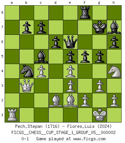 Last move : 0-1 2018 September 20 4:23:3 [Event "FICGS__CHESS__CUP_STAGE_1_GROUP_05__000002"] [Site "FICGS"] [Date "2018.07.02"] [Round "1"] [White "Pech,Stepan"] [Black "Flores,Luis"] [Result "0-1"] [WhiteElo "1716"] [BlackElo "2024"] 1.c4 e5 2.Nc3 Nf6 3.Nf3 Nc6 4.g3 Bb4 5.Bg2 O-O 6.O-O d6 7.d3 h6 8.Bd2 a5 9.a3 Bc5 10.e3 Re8 11.Qc2 Bf5 12.Nh4 Bh7 13.Rfd1 Qb8 14.b3 Qc8 15.Ne4 Nxe4 16.dxe4 Qe6 17.Bf3 Rf8 18.Nf5 g6 19.Nh4 Kg7 20.Be2 f5 21.b4 axb4 22.axb4 Nxb4 23.Qb3 Rxa1 24.Rxa1 g5 0-1 English Opening Kingside Castling by player Black (move 5) Kingside Castling by player White (move 6) Player Black won this chess game. Follow this game move after move (download)It is the aim of the modern school, not to treat every position according to one general law, but according to the principle inherent in the position. (Richard Reti) Ich möchte Schüler heranbilden, die das Vermögen haben, selbst zu denken und Kritik zu üben. (Emanuel Lasker) Un entendimiento minucioso de las típicas continuaciones de mate hacen de las mas complicadas combinaciones de sacrificio que conducen hacia ellas no solo no dificiles, sino casi un asunto de rutina. (Siegbert Tarrasch) Je ne crois pas en la psychologie, je crois aux bons coups. (Robert Fischer) A belief is an idea the mind possesses, an idea that possesses the mind. (Robert Oxden Bolton)