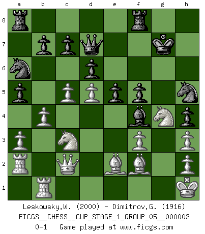 Last move : 0-1 2018 October 6 6:54:17 [Event "FICGS__CHESS__CUP_STAGE_1_GROUP_05__000002"] [Site "FICGS"] [Date "2018.07.02"] [Round "1"] [White "Leskowsky,Wandrille"] [Black "Dimitrov,George"] [Result "0-1"] [WhiteElo "2000"] [BlackElo "1916"] 1.c4 Nf6 2.Nc3 g6 3.e4 d6 4.d4 Bg7 5.Nf3 O-O 6.Be2 e5 7.d5 a5 8.Bg5 h6 9.Bh4 Na6 10.Nd2 Bd7 11.O-O Qe8 12.b3 Nh7 13.a3 h5 14.f3 Bh6 15.Bf2 Qe7 16.Kh1 h4 17.Ra2 Kg7 18.Qc2 Bf4 19.Rb1 Qg5 20.Nf1 Nf6 21.b4 Nh5 22.c5 Bh3 23.gxh3 Qd8 24.Ne3 Qd7 25.Ng4 f5 26.exf5 gxf5 0-1 This chess game has been lost on time (started : 2018.07.02 2:46:13) English Opening Kingside Castling by player Black (move 5) Kingside Castling by player White (move 11) Player Black won this chess game. Follow this game move after move (download)A player surprised is half beaten. (Proverb) Vom Schach wurde gesagt das Leben sei dafür nicht lange genug. Aber das ist der Fehler des Lebens, nicht des Schach'. (Irving Chernev) Una buena ofensiva y una buena defensa, comienzan ambas con un buen desarrollo. (Bruce A. Moon) A chaque perte on perd un peu de soi. (Joël Lautier) Hardware: the parts of a computer that can be kicked. (Jeff Persis)