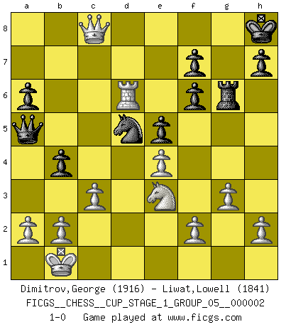 Last move : 1-0 2018 August 10 2:20:4 [Event "FICGS__CHESS__CUP_STAGE_1_GROUP_05__000002"] [Site "FICGS"] [Date "2018.07.02"] [Round "1"] [White "Dimitrov,George"] [Black "Liwat,Lowell"] [Result "1-0"] [WhiteElo "1916"] [BlackElo "1841"] 1.e4 c5 2.Nf3 Nc6 3.d4 cxd4 4.Nxd4 e5 5.Nb5 d6 6.N1c3 a6 7.Na3 Nf6 8.Bg5 Be7 9.Nc4 O-O 10.Bxf6 gxf6 11.Ne3 Nd4 12.Ncd5 Kh8 13.c3 Nc6 14.Qh5 Be6 15.g3 Rg8 16.Bh3 Rg5 17.Qh4 Bf8 18.Bf5 Bxf5 19.Nxf5 Bg7 20.O-O-O Rc8 21.Kb1 b5 22.Rd3 Rg6 23.Rhd1 Bf8 24.Nde3 Qa5 25.Nxd6 Bxd6 26.Rxd6 b4 27.Qh3 Ne7 28.R1d5 Nxd5 29.Qxc8+ 1-0 Sicilian : Labourdonnais-Loewenthal (Kalashnikov) variation Kingside Castling by player Black (move 9) Queenside Castling by player White (move 20) Player White won this chess game. Follow this game move after move (download)The passed pawn is a criminal, who should be kept under lock and key. Mild measures, such as police surveillance, are not sufficient. (Nimzovitch) Wenn man heute mit 14 Jahren noch kein GM ist, kann man es vergessen. (Viswanathan Anand) Con o sin el título, Bobby Fischer fue sin lugar a dudas el mas grande jugador de su época. (Burt Hochberg) Si je n'étais pas joueur d'échecs, je serais le meilleur dans quelque chose d'autre. (Anatoli Karpov) The Internet is the first thing that humanity has build that humanity doesn't understand, the largest experiment in anarchy that we have ever had. (Eric Schmidt)