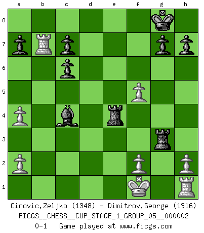 Last move : 0-1 2018 August 13 18:33:0 [Event "FICGS__CHESS__CUP_STAGE_1_GROUP_05__000002"] [Site "FICGS"] [Date "2018.07.02"] [Round "1"] [White "Cirovic,Zeljko"] [Black "Dimitrov,George"] [Result "0-1"] [WhiteElo "1348"] [BlackElo "1916"] 1.e4 e5 2.Nf3 Nc6 3.c3 d5 4.exd5 Qxd5 5.Qb3 Nf6 6.Qxd5 Nxd5 7.Bb5 f6 8.d4 e4 9.Nfd2 f5 10.c4 Ndb4 11.Na3 Nd3+ 12.Ke2 Bxa3 13.bxa3 O-O 14.Bxc6 bxc6 15.a4 Rd8 16.Nb3 Ba6 17.Nd2 Rxd4 18.g4 Rad8 19.gxf5 Nxc1+ 20.Raxc1 Rxd2+ 21.Ke3 R8d4 22.Rb1 Bxc4 23.Rb7 R2d3+ 24.Kf4 e3 25.Kf3 e2 26.Kxe2 Re4+ 27.Kf1 Rg3 0-1 Ponziani Opening Kingside Castling by player Black (move 13) Player Black won this chess game. Follow this game move after move (download)Mistrust is the most necessary characteristic of the Chess player. (Siegbert Tarrasch) Die Arbeit ist etwas Unnatürliches. Die Faulheit allein ist göttlich. (Anatole France) En la vida, como en el Ajedrez, los Peones propios obstruyen nuestro camino. La gran fortuna de un hombre, su comodidad, placer, hijos, libros, que deberían ayudarle a ganar, con mucha frecuencia lo ponen en Jaque Mate. (Charles Buxton) Dieu déplace le joueur, et celui-ci la pièce. Quel Dieu derrière Dieu commence donc la trame ? Arturo Perez-Reverte (prix de littérature policière 1993). Over-the-board chess is the favorite of mortals, correspondence chess is the favorite of the gods. (Eduard Dyckhoff)