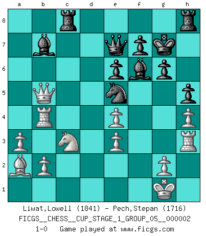 Last move : 1-0 2018 August 31 20:47:20 [Event "FICGS__CHESS__CUP_STAGE_1_GROUP_05__000002"] [Site "FICGS"] [Date "2018.07.02"] [Round "1"] [White "Liwat,Lowell"] [Black "Pech,Stepan"] [Result "1-0"] [WhiteElo "1841"] [BlackElo "1716"] 1.d4 Nf6 2.c4 e6 3.a3 d5 4.Nc3 c5 5.e3 dxc4 6.Bxc4 a6 7.Nf3 b5 8.Bd3 Bb7 9.h4 Nbd7 10.Kf1 Be7 11.Rh3 Rc8 12.e4 cxd4 13.Nxd4 Ne5 14.Bb1 Rc4 15.Be3 Nfg4 16.Ba2 Nxe3+ 17.fxe3 Rc8 18.Qh5 Bf6 19.Rd1 Qe7 20.Kg1 g6 21.Qe2 h5 22.Ndxb5 axb5 23.Qxb5+ Kf8 24.Rd4 Kg7 25.Rb4 1-0 Queen's pawn game Player White won this chess game. Follow this game move after move (download)Weak points or holes in the opponent's position must be occupied by pieces not Pawns. (Siegbert Tarrasch) Zu meiner Zeit war ein 20 jähriger ein junger Spieler, heute ist er ein Veteran. (Garry Kasparov) Las Aperturas te enseñan aperturas. ¡Los Finales te enseñan Ajedrez!. (Stephan Gerzadowicz) Celui qui prend des risques peut perdre, celui qui n'en prend pas perd toujours. (Xavier Tartacover) The hypothalamus is one of the most important parts of the brain, involved in many kinds of motivation, among other functions. The hypothalamus controls the 'Four Fs: Fighting, Fleeing, Feeding and Mating. (Unknown author)