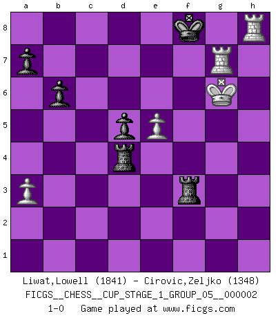 Last move : 1-0 2018 July 20 12:21:26 [Event "FICGS__CHESS__CUP_STAGE_1_GROUP_05__000002"] [Site "FICGS"] [Date "2018.07.02"] [Round "1"] [White "Liwat,Lowell"] [Black "Cirovic,Zeljko"] [Result "1-0"] [WhiteElo "1841"] [BlackElo "1348"] 1.d4 e6 2.e4 d5 3.e5 c5 4.c3 Nc6 5.f4 cxd4 6.cxd4 Bb4+ 7.Kf2 Qb6 8.Nf3 f6 9.a3 fxe5 10.fxe5 Nxd4 11.Nxd4 Bc5 12.Be3 Qxb2+ 13.Nd2 Bxd4 14.Qa4+ Bd7 15.Qxd4 Qxd4 16.Bxd4 Nh6 17.Bd3 O-O 18.Nf3 b6 19.h3 Nf5 20.Bxf5 Rxf5 21.Rhc1 Bb5 22.Rc7 h5 23.Kg3 g5 24.Rac1 Bc4 25.Re7 Raf8 26.Rxe6 g4 27.hxg4 hxg4 28.Kxg4 Be2 29.Rc7 Bxf3+ 30.gxf3 Rf4+ 31.Kg5 Rxd4 32.Rg6+ Kh8 33.Rh6+ Kg8 34.Kg6 Rxf3 35.Rg7+ Kf8 36.Rh8+ 1-0 Queen's pawn Kingside Castling by player Black (move 17) Player White won this chess game. Follow this game move after move (download)Many have become Chess Masters, no one has become the Master of Chess. (Siegbert Tarrasch) Pläne sind die Träume des Verständigen. (Ernst Freiherr von Feuchtersleben) El estómago es una parte esencial del maestro de Ajedrez. (Bent Larsen) D'abord les bases : Jouez et étudiez, puis étudiez et jouez, ensuite jouez et étudiez, puis étudiez et jouez. Deuxièmement : Donnez toujours le meilleur de vous-même ! (Ken Smith) Computers are like Old Testament gods; lots of rules and no mercy. (Joseph Campbell)