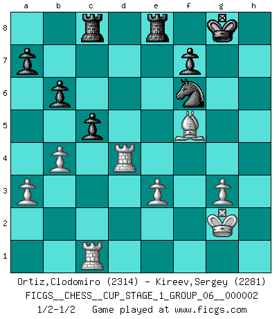 Last move : 1/2-1/2 2018 July 11 19:52:12 [Event "FICGS__CHESS__CUP_STAGE_1_GROUP_06__000002"] [Site "FICGS"] [Date "2018.07.02"] [Round "1"] [White "Ortiz,Clodomiro"] [Black "Kireev,Sergey"] [Result "1/2-1/2"] [WhiteElo "2314"] [BlackElo "2281"] 1.Nf3 Nf6 2.d4 d5 3.c4 c6 4.e3 Bf5 5.Nc3 e6 6.Nh4 Bg6 7.Nxg6 hxg6 8.Qb3 Qc7 9.Bd2 Nbd7 10.g3 Be7 11.Rc1 Rc8 12.a3 dxc4 13.Qxc4 O-O 14.Bg2 e5 15.Ne2 Qb6 16.Bc3 Bd6 17.O-O Rfe8 18.dxe5 Bxe5 19.b4 Bxc3 20.Qxc3 g5 21.h3 Ne5 22.Nd4 g4 23.hxg4 Nexg4 24.Bf3 Ne5 25.Be2 Qd8 26.Rfd1 Qd5 27.Qc2 g6 28.Qb1 Neg4 29.Rc5 Qd6 30.Nf5 Qf8 31.Rd4 b6 32.Rc1 Nxf2 33.Kxf2 gxf5 34.Qxf5 Qh6 35.Kg2 Qg6 36.Bd3 Qxf5 37.Bxf5 c5 1/2-1/2 Reti Opening Kingside Castling by player Black (move 13) Kingside Castling by player White (move 17) This chess game ended in a draw. Follow this game move after move (download)In Chess, at least, the brave inherit the earth. (Edmar Mednis) Ein bischen Romantik kann weder im Schach noch in der Liebe schaden. Also versuche ich mich ab und zu daran zu erinnern. (Nigel Short) Aquellos que dicen entender al Ajedrez, no entienden nada. (Robert Hubner) Le génie consiste à savoir transgresser les règles au moment opportun. (Teichmann) Once you start thinking you have nothing left to learn, you have everything to learn. (Steve Badget)