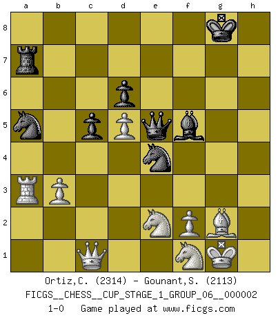Last move : 1-0 2018 August 21 2:23:36 [Event "FICGS__CHESS__CUP_STAGE_1_GROUP_06__000002"] [Site "FICGS"] [Date "2018.07.02"] [Round "1"] [White "Ortiz,Clodomiro"] [Black "Gounant,Stanislas"] [Result "1-0"] [WhiteElo "2314"] [BlackElo "2113"] 1.Nf3 f5 2.d4 Nf6 3.g3 g6 4.Bg2 Bg7 5.O-O O-O 6.c4 d6 7.Nc3 Nc6 8.d5 Na5 9.b3 c5 10.Rb1 a6 11.Re1 Rb8 12.e4 b5 13.cxb5 axb5 14.e5 Ng4 15.exd6 exd6 16.Ne2 b4 17.Nf4 Re8 18.Bb2 Rb7 19.Rxe8+ Qxe8 20.Bxg7 Rxg7 21.a3 bxa3 22.Ra1 Ra7 23.Rxa3 Nf6 24.Qc1 Ne4 25.h4 h6 26.Nh2 g5 27.hxg5 hxg5 28.Nh3 f4 29.gxf4 gxf4 30.Nxf4 Bf5 31.Nf1 Qe5 32.Ne2 1-0 Reti v Dutch Kingside Castling by player White (move 5) Kingside Castling by player Black (move 5) Player White won this chess game. Follow this game move after move (download)Why must I lose to this idiot ? (Aron Nimzovich) Der Freibauer hat für mich eine Seele, genau wie der Mensch, Wünsche, die unerkannt in ihm schlummern, und Befürchtungen, von deren Existenz er selbst kaum ahnt. (Aaron Nimzowitsch) Todos los jugadores de Ajedrez deberían tener un pasatiempo. (Savielly Tartakower) Il n'y a plus de joueurs du niveau de Jacob Murray dont la seule quête est le beau jeu, le plaisir de voir les pièces construire quelque chose. Sur 10 idées à la minute, 9 seront sans intérêt, la dernière s'avèrera géniale. (Christian Bauer) I'll be back. (Arnold Schwarzenegger)