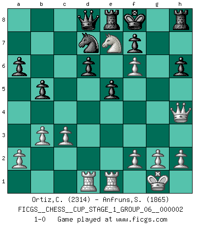 Last move : 1-0 2018 September 4 11:45:12 [Event "FICGS__CHESS__CUP_STAGE_1_GROUP_06__000002"] [Site "FICGS"] [Date "2018.07.02"] [Round "1"] [White "Ortiz,Clodomiro"] [Black "Anfruns,Salvador"] [Result "1-0"] [WhiteElo "2314"] [BlackElo "1865"] 1.e4 c5 2.Nf3 e6 3.d4 cxd4 4.Nxd4 Nf6 5.Nc3 Nc6 6.Ndb5 d6 7.Bf4 e5 8.Bg5 a6 9.Na3 Be7 10.Nc4 b5 11.Bxf6 gxf6 12.Ne3 f5 13.exf5 Bg5 14.Bd3 Nd4 15.O-O Rb8 16.Qh5 h6 17.Rad1 Kf8 18.Ncd5 Bb7 19.c3 Bxe3 20.Nxe3 Nc6 21.Be4 Na5 22.Bxb7 Rxb7 23.b3 Re7 24.Nd5 Re8 25.f6 Nc6 26.Rfe1 Nb8 27.Ne7 Nd7 28.Qh4 1-0 This chess game has been lost on time (started : 2018.07.02 2:46:14) Sicilian : Anderssen variation Kingside Castling by player White (move 15) Player White won this chess game. Follow this game move after move (download)Good positions don't win games, good moves do. (Gerald Abrahams) Wie ich sie so einen nach dem anderen nieder mähte wurde meine Überlegenheit offensichtlich. (José Raúl Capablanca) Nos gusta pensar. (Gary Kasparov) Il vaut mieux sacrifier les pièces de l'adversaire. (Xavier Tartacover) Empty your mind, be formless, shapeless — like water. (Bruce Lee)