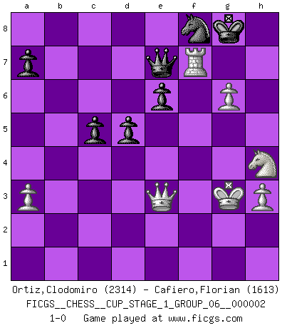 Last move : 1-0 2018 August 24 16:41:23 [Event "FICGS__CHESS__CUP_STAGE_1_GROUP_06__000002"] [Site "FICGS"] [Date "2018.07.02"] [Round "1"] [White "Ortiz,Clodomiro"] [Black "Cafiero,Florian"] [Result "1-0"] [WhiteElo "2314"] [BlackElo "1613"] 1.d4 g6 2.c4 Bg7 3.Nc3 c5 4.d5 Bxc3+ 5.bxc3 f5 6.e4 fxe4 7.f3 Nf6 8.fxe4 d6 9.Bd3 O-O 10.Bh6 Rf7 11.h3 Nh5 12.Nf3 Ng3 13.Rg1 Qa5 14.Kf2 Nh5 15.e5 Qxc3 16.e6 Rf6 17.Re1 Na6 18.Rc1 Qb2+ 19.Rc2 Qa3 20.Be4 Nb4 21.Rd2 Qc3 22.g4 Nf4 23.Kg3 Nxe6 24.dxe6 Bxe6 25.Bg5 Raf8 26.Bxb7 h5 27.gxh5 Qxc4 28.Bxf6 Rxf6 29.a3 Na6 30.Re4 Qb5 31.Rxe6 Rxe6 32.Bd5 Nc7 33.Qe1 Qd7 34.Bxe6+ Nxe6 35.hxg6 Nf8 36.Nh4 e6 37.Qe3 Qe7 38.Rf2 d5 39.Rf7 1-0 Beefeater defense Kingside Castling by player Black (move 9) Player White won this chess game. Follow this game move after move (download)No other master has such a terrific will to win. At the board he radiates danger, and even the strongest opponents tend to freeze, like rabbits when they smell a panther. Even his weaknesses are dangerous. As white, his opening game is predictable - you can make plans against it - but so strong that your plans almost never work. In the middle game his precision and invention are fabulous, and in the end game you simply cannot beat him. (Anonymous German Expert) Sitze auf Deine Hände. (Siegbert Tarrasch) El Ajedrez es un invernadero donde los frutos del carácter pueden madurar mas completamente que en la vida. (Edward Morgan Foster) Même si vous avez un bon coup à faire, regardez toujours s'il n'y en a pas un qui lui soit préférable. (Pedro Damiano) Drag your thoughts away from your troubles... by the ears, by the heels, or any other way you can manage it. (Mark Twain)
