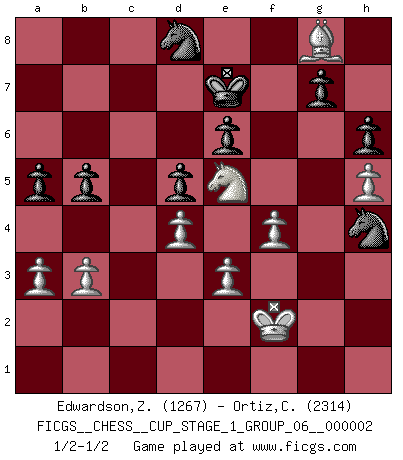 Last move : 1/2-1/2 2018 September 4 7:4:49 [Event "FICGS__CHESS__CUP_STAGE_1_GROUP_06__000002"] [Site "FICGS"] [Date "2018.07.02"] [Round "1"] [White "Edwardson,Zachariah"] [Black "Ortiz,Clodomiro"] [Result "1/2-1/2"] [WhiteElo "1267"] [BlackElo "2314"] 1.d4 Nf6 2.Nf3 d5 3.Bf4 Bf5 4.e3 e6 5.Nbd2 Bd6 6.Bxd6 cxd6 7.c4 dxc4 8.Bxc4 Nc6 9.Qb3 Qe7 10.Rc1 O-O 11.Qa3 Rac8 12.O-O a6 13.Nh4 Be4 14.Nxe4 Nxe4 15.Nf3 d5 16.Qxe7 Nxe7 17.Bd3 f6 18.h4 h6 19.g4 Nd6 20.h5 Nc4 21.b3 Nd6 22.Kg2 Rc6 23.Rxc6 Nxc6 24.Rc1 Rc8 25.Ne1 Kf7 26.Bg6+ Ke7 27.Nd3 Nd8 28.Rxc8 Nxc8 29.f4 Nc6 30.Nc5 Nd6 31.Bh7 a5 32.Bg8 Nd8 33.Kf3 b6 34.Na4 f5 35.gxf5 b5 36.Nc5 Nxf5 37.a3 Kf6 38.Nd7+ Ke7 39.Ne5 Nh4+ 40.Kf2 1/2-1/2 Queen's pawn game Kingside Castling by player Black (move 10) Kingside Castling by player White (move 12) This chess game ended in a draw. Follow this game move after move (download)All that matters on the Chessboard is good moves. (Bobby Fischer) Wer nie einen Fehler gemacht hat, hat nie etwas Neues ausprobiert. (Albert Einstein) El Ajedrez es un juego de pelea el cual es puramente intelectual e incluye la suerte. (Richard Reti) Il n'y a pas eu de défaite parce que je ne crois pas que cet ordinateur ait jamais existé. IBM a triché en refusant d'imprimer les modes de recherche de la machine. C'est évident, pendant le match, des coups décisifs ont été joués par des êtres humains. Aujourd'hui, les meilleurs spécialistes en informatique ne peuvent toujours pas expliquer comment Deep-Blue a pu jouer contre la logique des ordinateurs. IBM a gagné une guerre de communication, mais ils sont incapables de prouver que l'ordinateur a gagné tout seul. (Garry Kasparov) The Movers & Shakers of this world are those who play chess in the mornings and go to the disco in the evenings. (Dinesh De Silva)