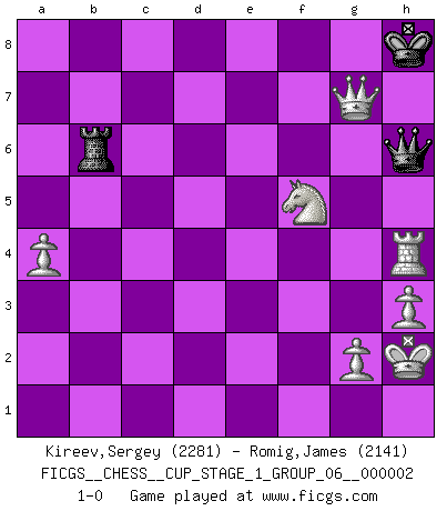 Last move : 1-0 2018 July 10 9:37:10 [Event "FICGS__CHESS__CUP_STAGE_1_GROUP_06__000002"] [Site "FICGS"] [Date "2018.07.02"] [Round "1"] [White "Kireev,Sergey"] [Black "Romig,James"] [Result "1-0"] [WhiteElo "2281"] [BlackElo "2141"] 1.e4 Nf6 2.e5 Nd5 3.d4 d6 4.c4 Nb6 5.exd6 exd6 6.Nc3 Be7 7.Bd3 Nc6 8.Nge2 O-O 9.O-O Re8 10.b3 Bg4 11.Be3 Bf6 12.h3 Bxe2 13.Bxe2 d5 14.c5 Nc8 15.b4 N8e7 16.b5 Na5 17.Bd3 c6 18.Qc2 g6 19.Rad1 Bg7 20.Qa4 b6 21.bxc6 Nexc6 22.Ne2 bxc5 23.dxc5 Rb8 24.Rb1 Bb2 25.Bd2 Nc4 26.Bf4 N6e5 27.Bxc4 dxc4 28.Rfd1 Qe7 29.Rd5 Qe6 30.Rd6 Qc8 31.Be3 c3 32.Rbd1 a5 33.a3 Qb7 34.Rb6 Qe7 35.Nf4 Rxb6 36.cxb6 Rc8 37.Nd5 Qe6 38.b7 Rb8 39.Bh6 Kh8 40.Ne3 f6 41.Rd5 Qb6 42.Rb5 Qc6 43.Qxa5 Nd7 44.Qb4 c2 45.Nxc2 Bc3 46.Qb3 g5 47.Qf7 f5 48.a4 Bf6 49.Rxf5 Bc3 50.Nb4 Qxb7 51.Nd5 Qc6 52.Nxc3 Rg8 53.Ne4 Qxh6 54.Qxd7 Qg6 55.Nd6 h5 56.Qe7 h4 57.f4 gxf4 58.Qxh4+ Kg7 59.Rxf4 Rb8 60.Nf5+ Kf8 61.Qe7+ Kg8 62.Rg4 Rb1+ 63.Kh2 Rb6 64.Qe8+ Kh7 65.Rh4+ Qh6 66.Qf7+ Kh8 67.Qg7+ 1-0 Alekhine's defense : Exchange variation Kingside Castling by player Black (move 8) Kingside Castling by player White (move 9) 10 pieces endgame at move 59 : White KQRNPPP , Black KQR WHITE : King + 1 Queen 1 Rook 1 Knight 3 Pawns BLACK : King + 1 Queen 1 Rook Player White won this chess game. Follow this game move after move (download)My style is somewhere between that of Tal and Petrosian. (Reshevsky) Alle Schachspieler sollten auch ein Hobby haben. (Savielly Grigorievitsch Tartakower) Cuando tu casa esta en llamas, no puedes ser molestado por tus vecinos. O, como decinos en Ajedrez, si tu Rey esta bajo ataque, no te preocupa perder un Peón del lado de la Reina. (Gary Kasparov) Les ravages du H expliquent la différence de niveau entre Tal et Thal [Abergel]. I'm extremely disappointed. I send you out for exciting, new designer drugs, you come back with tomato sauce. (Gregory House, House M.D.)