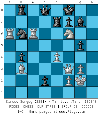 Last move : 1-0 2018 November 1 23:59:18 [Event "FICGS__CHESS__CUP_STAGE_1_GROUP_06__000002"] [Site "FICGS"] [Date "2018.07.02"] [Round "1"] [White "Kireev,Sergey"] [Black "Tanriover,Taner"] [Result "1-0"] [WhiteElo "2281"] [BlackElo "2024"] 1.e4 e5 2.Nf3 Nc6 3.Bb5 Nf6 4.O-O Be7 5.Re1 d6 6.c3 O-O 7.d4 Bd7 8.Ba4 a6 9.Bc2 Bg4 10.d5 Nb8 11.h3 Bh5 12.Nbd2 Nbd7 13.Nf1 Bg6 14.Ng3 c6 15.dxc6 bxc6 16.Nh4 Re8 17.Bg5 Qc7 18.Ngf5 Bf8 19.Rc1 a5 20.Nxg6 hxg6 21.Ne3 Be7 22.h4 Rab8 23.Rb1 Nb6 24.g3 Red8 25.Bxf6 Bxf6 26.Kg2 d5 27.Qf3 d4 28.cxd4 exd4 29.Ng4 Nd7 30.Bd3 c5 31.b3 a4 32.Bc4 axb3 33.axb3 Re8 34.Rh1 Nb6 35.Bd3 Nd7 36.Bc4 Nb6 37.Bd3 Nd7 38.h5 g5 39.h6 Qc6 40.hxg7 Bxg7 41.Bc4 Re7 42.Bd5 Qg6 43.Ra1 Kf8 44.Ra7 Nb6 45.Ra6 Qd6 46.b4 cxb4 47.Rc1 Qd8 48.Bb3 d3 49.Rc6 d2 50.Nf6 1-0 Ruy Lopez : Berlin defense, 4.O-O Kingside Castling by player White (move 4) Kingside Castling by player Black (move 6) Player White won this chess game. Follow this game move after move (download)Bobby is the most misunderstood, misquoted celebrity walking the face of this earth. (Yasser Seirawan) Wenn es im Universum noch irgendwo intelligente Lebewesen gibt, dann kennen sie Go. (Emanuel Lasker) Bobby Fischer es el mas grande genio de Ajedrez de todos los tiempos. (Alexander Kotov) On est toujours la mazette de quelqu'un d'autre. (Anonyme) Patience, use the Force, think ! (Obi-Wan Kenobi in Star Wars ep.2)