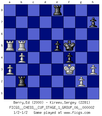 Last move : 1/2-1/2 2018 July 14 11:55:25 [Event "FICGS__CHESS__CUP_STAGE_1_GROUP_06__000002"] [Site "FICGS"] [Date "2018.07.02"] [Round "1"] [White "Berry,Ed"] [Black "Kireev,Sergey"] [Result "1/2-1/2"] [WhiteElo "2000"] [BlackElo "2281"] 1.e4 c5 2.f4 e6 3.Nc3 d5 4.Bb5+ Bd7 5.Bxd7+ Qxd7 6.Nf3 Nc6 7.d3 g6 8.O-O Bg7 9.f5 gxf5 10.exd5 Nd4 11.dxe6 fxe6 12.Nxd4 Bxd4+ 13.Kh1 Ne7 14.Qh5+ Ng6 15.Bg5 O-O 16.Rae1 Rf7 17.Bd2 Bg7 18.b3 b5 19.Ne2 c4 20.Nf4 Nxf4 21.Bxf4 cxd3 22.cxd3 Qxd3 23.Rf3 Qd4 24.Qg5 Re8 25.Be5 Qd8 26.Qf4 Bf6 27.h3 a6 28.Rg3+ Kh8 29.Rge3 Qd5 30.R3e2 Bg7 31.Rd2 Bxe5 32.Rxe5 Qc6 33.Qd4 Kg8 34.Rc5 Qb7 35.Qf4 Qe7 36.Qg3+ Kf8 37.Qe5 Qf6 38.Rd6 Qxe5 39.Rxe5 Kg7 40.Rxa6 Kf6 41.Rxb5 Rd7 42.R5b6 Rd1+ 43.Kh2 Rd2 44.b4 f4 45.Kg1 Kf5 46.Rb5+ e5 47.R6a5 Rb2 48.a3 Rb1+ 49.Kf2 Rb2+ 50.Kf3 Rb3+ 51.Kf2 Rb2+ 52.Kf3 1/2-1/2 Sicilian : Grand Prix attack Kingside Castling by player White (move 8) Kingside Castling by player Black (move 15) This chess game ended in a draw. Follow this game move after move (download)The beauty of a move lies not in its' appearance but in the thought behind it. (Siegbert Tarrasch) Um dein Spiel zu verbessern musst du zuallererst das Endspiel studieren, denn diese kann unabhängig studiert werden. Die Eröffnung und das Mittelspiel müssen immer in Bezug gesetzt werden zum Endspiel. (José Raúl Capablanca) No todos los artistas son jugadores de Ajedrez, pero todos los jugadores de Ajedrez son artistas. (Marcel Duchamp) La tactique est l'élément le plus important du milieu de jeu. (Siegbert Tarrasch) Kids, you tried your best and you failed miserably. The lesson is, never try. (Simpsons)