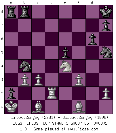 Last move : 1-0 2018 July 6 16:27:48 [Event "FICGS__CHESS__CUP_STAGE_1_GROUP_06__000002"] [Site "FICGS"] [Date "2018.07.02"] [Round "1"] [White "Kireev,Sergey"] [Black "Osipov,Sergey"] [Result "1-0"] [WhiteElo "2281"] [BlackElo "1898"] 1.e4 c5 2.Nf3 d6 3.d4 cxd4 4.Nxd4 Nf6 5.Nc3 a6 6.Be3 e5 7.Nb3 Be6 8.f3 Be7 9.Qd2 O-O 10.O-O-O Nbd7 11.g4 b5 12.g5 Nh5 13.a3 Qc7 14.Kb1 Rfb8 15.Nd5 Bxd5 16.exd5 a5 17.Rg1 g6 18.Rg4 f5 19.gxf6 Ndxf6 20.Rh4 Kh8 21.a4 Nd7 22.Re4 bxa4 23.Rxa4 Bd8 24.Qe2 Qb7 25.Bc1 Qc7 26.Qc4 Qxc4 27.Rxc4 a4 28.Nd2 Nb6 29.Rc6 Nxd5 30.Ne4 Nb4 31.Rcxd6 a3 32.R1d2 Be7 33.Rd7 Bf8 34.b3 Bh6 35.c3 Bxd2 36.Rxd2 a2+ 37.Ka1 1-0 Sicilian : Najdorf, Byrne (English) attack Kingside Castling by player Black (move 9) Queenside Castling by player White (move 10) Player White won this chess game. Follow this game move after move (download)All Chess players should have a hobby. (Savielly Tartakower) Wie gewinnt Tal? Er entwickelt alle seine Figuren in die Brettmitte und opfert sie dann irgendwo. (Robert James Fischer) Siempre es mejor sacrificar los hombres de tu oponente. (Savielly Tartakower) Votre seul travail dans les ouvertures est d'obtenir un milieu de partie jouable. (Lajos Portish) It's not the will to win, but the will to prepare to win that makes the difference. (Bear Bryant)