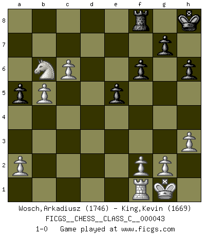 Last move : 1-0 2007 November 7 12:12:12 [Event "FICGS__CHESS__CLASS_C__000043"] [Site "FICGS"] [Date "2007.05.12"] [Round "1"] [White "Wosch,Arkadiusz"] [Black "King,Kevin"] [Result "1-0"] [WhiteElo "1746"] [BlackElo "1669"] 1.e4 e5 2.Nf3 Nc6 3.Bc4 Bc5 4.c3 Nf6 5.d3 d6 6.O-O O-O 7.Bb3 h6 8.Nbd2 Kh7 9.Nc4 Be6 10.d4 Bxc4 11.Bxc4 exd4 12.cxd4 Bb6 13.Qd3 Kh8 14.Bd2 d5 15.exd5 Nxd5 16.Qb3 Nf6 17.d5 Na5 18.Bxa5 Bxa5 19.Qxb7 Bb6 20.Qc6 Qd6 21.Qxd6 cxd6 22.Bb5 Rac8 23.Bc6 Ng4 24.Rae1 Rc7 25.h3 Nf6 26.b4 a5 27.b5 Nd7 28.Nd2 Ne5 29.Rxe5 dxe5 30.Nc4 Rxc6 31.dxc6 f6 32.Nxb6 1-0 Giuoco Piano Kingside Castling by player White (move 6) Kingside Castling by player Black (move 6) Player White won this chess game. Follow this game move after move (download)Life is a kind of Chess, with struggle, competition, good and ill events. (Benjamin Franklin) Wenn Schach ein enormer Dschungel ist, der seine Myriaden von Geheimnissen nicht preisgeben will, dann sind Computer die Kettensägen einer gewaltigen ökologisch unsensiblen Nutzholzfirma. (Nigel Short) El Ajedrez era la lengua materna de Capablanca. (Reti) Donnez-moi un Cavalier en 6e et je gagnerais toutes mes parties. (Steinitz) Gambling : The sure way of getting nothing from something. (Wilson Mizner)