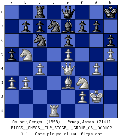 Last move : 0-1 2018 July 6 16:26:59 [Event "FICGS__CHESS__CUP_STAGE_1_GROUP_06__000002"] [Site "FICGS"] [Date "2018.07.02"] [Round "1"] [White "Osipov,Sergey"] [Black "Romig,James"] [Result "0-1"] [WhiteElo "1898"] [BlackElo "2141"] 1.e4 Nf6 2.e5 Nd5 3.d4 d6 4.Nf3 Bf5 5.Bd3 Bxd3 6.Qxd3 e6 7.O-O dxe5 8.dxe5 Nc6 9.Qe2 Be7 10.c4 Nb6 11.Nc3 O-O 12.Qe4 Nd7 13.Rd1 Qc8 14.Be3 Rd8 15.h4 h6 16.g4 Nf8 17.a3 a5 18.Kg2 Rxd1 19.Rxd1 Qe8 20.Nb5 Rc8 21.h5 Nd7 22.b3 Kh8 0-1 Alekhine's defense : Modern variation Kingside Castling by player White (move 7) Kingside Castling by player Black (move 11) Player Black won this chess game. Follow this game move after move (download)The game of Chess is not merely an idle amusement; several very valuable qualities of the mind are to be acquired and strengthened by it, so as to become habits ready on all occasions; for life is a kind of Chess. (Benjamin Franklin) Schach ist ein Kampf gegen den Fehler. (Johannes Herrman Zukertort) Un juego de Ajedrez es un dialogo, una conversación entre un jugador y su oponente. Cada movimiento del oponente puede contener amenazas o tropiezos, pero un jugador no se puede defender de las amenazas o tomar ventaja de los tropiezos si es que no se pregunta a sí mismo: ¿Que es lo que mi oponente va a hacer después de cada movida?. (Bruce A. Moon) Il n'y a plus de joueurs du niveau de Jacob Murray dont la seule quête est le beau jeu, le plaisir de voir les pièces construire quelque chose. Sur 10 idées à la minute, 9 seront sans intérêt, la dernière s'avèrera géniale. (Christian Bauer) It is not titles that honor men, but men that honor titles. (Niccolo Machiavelli)