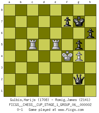 Last move : 0-1 2018 July 19 7:17:57 [Event "FICGS__CHESS__CUP_STAGE_1_GROUP_06__000002"] [Site "FICGS"] [Date "2018.07.02"] [Round "1"] [White "Gulbis,Harijs"] [Black "Romig,James"] [Result "0-1"] [WhiteElo "1708"] [BlackElo "2141"] 1.e4 Nf6 2.e5 Nd5 3.d4 d6 4.exd6 exd6 5.Nf3 Be7 6.c4 Nb6 7.Nc3 O-O 8.Be3 Bf6 9.b3 Re8 10.h3 c5 11.Rc1 cxd4 12.Nxd4 d5 13.Be2 dxc4 14.bxc4 Nxc4 15.Bxc4 Bxd4 16.Qf3 Be6 17.Bxe6 Rxe6 18.O-O Nc6 19.Rfd1 Qh4 20.Bxd4 Nxd4 21.Qxb7 Rae8 22.Qd5 Rd8 23.Qb7 h6 24.Qxa7 Rg6 25.Kf1 Kh7 26.Rb1 Qf4 27.Rb4 Rf6 28.Ne4 Qxe4 29.Rbxd4 Qe3 30.f3 Re6 31.Qc5 Qe2+ 32.Kg1 Rg6 33.g4 Qxf3 34.Rxd8 Qg3+ 35.Kf1 Qxh3+ 36.Ke1 Qh4+ 37.Qf2 Re6+ 38.Kf1 Rf6 39.Qxf6 Qxf6+ 40.Kg2 Qe6 41.Kf3 Qxa2 42.R8d5 Qh2 43.Rh5 Qb2 44.R1d5 g6 45.Rhe5 Qc3+ 46.Kf2 Qc4 47.Kf3 Kg7 48.Rc5 Qf1+ 49.Kg3 Qg1+ 50.Kf4 Qf2+ 51.Ke4 Qg2+ 52.Kf4 g5+ 0-1 Alekhine's defense Kingside Castling by player Black (move 7) Kingside Castling by player White (move 18) 10 pieces endgame at move 39 : White KRRPP , Black KQPPP WHITE : King + 2 Rooks 2 Pawns BLACK : King + 1 Queen 3 Pawns 9 pieces endgame at move 41 : White KRRP , Black KQPPP WHITE : King + 2 Rooks 1 Pawn BLACK : King + 1 Queen 3 Pawns Player Black won this chess game. Follow this game move after move (download)Who is your opponent tonight, tonight I am playing against the Black pieces. (Akiba Rubinstein) Jeder weiß, dass Gasprom Putins persönliches Machtinstrument ist. Die Firma wird vom Kreml aus geleitet und wird schon deshalb nie transparent sein. (Garry Kasparov) Los finales de Peón son del Ajedrez lo que el cesped es del Golf. (Cecil Purdy) Je menace de comprendre la position. (Anonyme) I can't decide which is riskier; taking crazy risks, or taking advice on crazy risks from a crazy risk taker. (Gregory House in House M.D.)