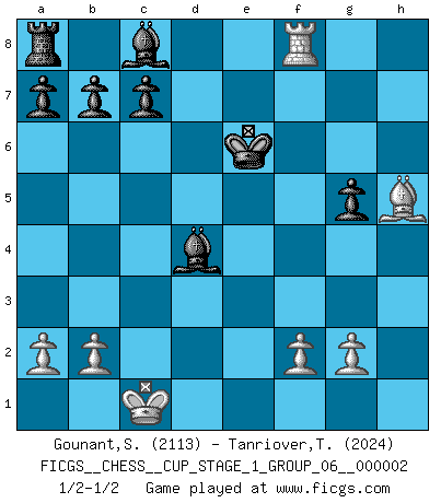 Last move : 1/2-1/2 2018 November 16 8:26:9 [Event "FICGS__CHESS__CUP_STAGE_1_GROUP_06__000002"] [Site "FICGS"] [Date "2018.07.02"] [Round "1"] [White "Gounant,Stanislas"] [Black "Tanriover,Taner"] [Result "1/2-1/2"] [WhiteElo "2113"] [BlackElo "2024"] 1.d4 f5 2.Bg5 h6 3.Bh4 g5 4.e4 Nf6 5.e5 e6 6.exf6 Qxf6 7.Bg3 f4 8.Bd3 Nc6 9.Qh5+ Kd8 10.Bxf4 Qxf4 11.Ne2 Qf6 12.c3 d5 13.h4 Bg7 14.Rh3 e5 15.Rf3 Qd6 16.Qf7 Bf8 17.Rf6 Qd7 18.Qh5 exd4 19.hxg5 Qe8 20.Bg6 Qe7 21.cxd4 Nxd4 22.Nbc3 Nxe2 23.Nxd5 Ng3 24.Nxe7 Nxh5 25.O-O-O Kxe7 26.Rf7+ Ke6 27.Bxh5 hxg5 28.Rd8 Bg7 29.Rxh8 Bxh8 30.Rf8 Bd4 1/2-1/2 Dutch, 2.Bg5 variation Queenside Castling by player White (move 25) This chess game ended in a draw. Follow this game move after move (download)Bobby just drops the pieces and they fall on the right squares. (Miguel Najdorf) Früher wurde jeder komplizierte Zug, jedes interessante Opfer mit großem Beifall und Enthusiasmus aufgenommen. Heute schaltet man einfach seinen Fritz an, und man kann sehen, was los ist, ob der Zug geht oder nicht. (Vladimir Kramnik) Aunque la mayoría de la gente disfruta observar las partidas de los grandes Maestros de ataque, algunos de los jugadores mas notables en la historia han sido los jugadores silenciosos posicionales. Lentamente ellos te aplastan despojandote de tu espacio, congestionando tus piezas y dejandote virtualmente sin nada que hacer. (Yasser Seirawan) Plusieurs personnes se sont demandées comment Tal faisait pour gagner... En fait, c'est très simple ! Il met ses pièces au centre de l'échiquier et les sacrifie quelque part ! (David Bronstein) The problem with troubleshooting is that trouble shoots back. (Anonymous)