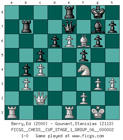 Last move : 1-0 2018 August 23 15:10:37 [Event "FICGS__CHESS__CUP_STAGE_1_GROUP_06__000002"] [Site "FICGS"] [Date "2018.07.02"] [Round "1"] [White "Berry,Ed"] [Black "Gounant,Stanislas"] [Result "1-0"] [WhiteElo "2000"] [BlackElo "2113"] 1.Nf3 f5 2.d4 Nf6 3.g3 g6 4.Bg2 Bg7 5.O-O O-O 6.c4 d6 7.Nc3 Nc6 8.d5 Na5 9.b3 c5 10.Bd2 a6 11.e4 b5 12.e5 Ng4 13.exd6 exd6 14.h3 b4 15.Ne2 Re8 16.Rb1 Nf6 17.Ng5 Ra7 18.Nf4 Nb7 19.Qc2 Qd7 20.Rbe1 Nd8 21.Bc1 a5 22.Bb2 a4 23.Nge6 Nxe6 24.dxe6 Qe7 25.Bc6 axb3 26.axb3 Rf8 27.Ra1 Rc7 28.Bg2 Bb7 29.Bxb7 Rxb7 30.Rfe1 Re8 31.Bxf6 1-0 Reti v Dutch Kingside Castling by player White (move 5) Kingside Castling by player Black (move 5) Player White won this chess game. Follow this game move after move (download)You can only get good at Chess if you love the game. (Bobby Fischer) Computer sind die einzigen Gegner, die nicht immer eine Ausrede auf Lager haben, wenn sie gegen mich verlieren. (Robert James Fischer) El Ajedrez es imaginación. (David Bronstein) Echiquier : carré parfait, comme la Jérusalem nouvelle décrite par l'auteur de l'Apocalypse, huit cases sur huit, exaltation du chiffre 4, symbole du cosmos aux quatre horizons... où le noir et le blanc, l'ombre et la lumière, le mal et le bien s'entremêlent et se conjuguent. (Robert Couffignal, Le Gambit du poète) . 'gn is not allowed in chess unless n is an integer between 1 and 8 inclusive, where 1 and 8 are to interpreted as the standard numerals standing for integers in the ordered real-closed field R, with the *canonical* ordering. (As opposed to, say, an integer in the domain Z[2+i*sqrt(5)] or an integer in some exotic Grothendieck topos). (Normajean Yates)