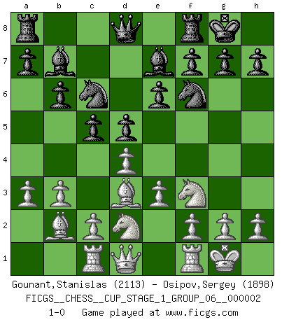 Last move : 1-0 2018 July 11 7:15:31 [Event "FICGS__CHESS__CUP_STAGE_1_GROUP_06__000002"] [Site "FICGS"] [Date "2018.07.02"] [Round "1"] [White "Gounant,Stanislas"] [Black "Osipov,Sergey"] [Result "1-0"] [WhiteElo "2113"] [BlackElo "1898"] 1.d4 Nf6 2.Nf3 d5 3.e3 e6 4.Bd3 c5 5.b3 Nc6 6.O-O Be7 7.Bb2 O-O 8.Nbd2 b6 9.a3 Bb7 10.Rc1 1-0 Queen's pawn game Kingside Castling by player White (move 6) Kingside Castling by player Black (move 7) Player White won this chess game. Follow this game move after move (download)The stomach is an essential part of the Chess master. (Bent Larsen) Drei Punkte vor allen anderen ist wie einer, der im weißen Anzug posiert, während der Rest in Müllsäcke gekleidet dasteht. (Viktor Kortschnoi) En el Ajedrez, tal como es jugado por los Maestros, practicamente la suerte es eliminada. (Emanuel Lasker) Il n'y a pas eu de défaite parce que je ne crois pas que cet ordinateur ait jamais existé. IBM a triché en refusant d'imprimer les modes de recherche de la machine. C'est évident, pendant le match, des coups décisifs ont été joués par des êtres humains. Aujourd'hui, les meilleurs spécialistes en informatique ne peuvent toujours pas expliquer comment Deep-Blue a pu jouer contre la logique des ordinateurs. IBM a gagné une guerre de communication, mais ils sont incapables de prouver que l'ordinateur a gagné tout seul. (Garry Kasparov) You cannot beat a roulette table unless you steal money from it. (Albert Einstein)