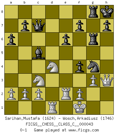Last move : 0-1 2008 January 3 10:21:21 [Event "FICGS__CHESS__CLASS_C__000043"] [Site "FICGS"] [Date "2007.05.12"] [Round "1"] [White "Sarihan,Mustafa"] [Black "Wosch,Arkadiusz"] [Result "0-1"] [WhiteElo "1624"] [BlackElo "1746"] 1.e4 c5 2.Nf3 Nc6 3.d4 cxd4 4.Nxd4 Nf6 5.Nc3 d6 6.Bb5 Bd7 7.Bg5 e6 8.O-O Be7 9.Nb3 a6 10.Be2 O-O 11.Bxf6 gxf6 12.Bd3 Kh8 13.Qh5 Rg8 14.e5 f5 15.exd6 Bxd6 16.Rad1 Qc7 17.Rfe1 Ne5 18.Bf1 Ng4 19.g3 Bc6 20.Nd4 Nxh2 21.Bg2 Ng4 22.Re2 Bxg2 23.Kxg2 Bc5 24.Rh1 Rg7 25.Rd1 Rag8 26.Kf1 Rg6 27.Qh3 f4 0-1 This chess game has been lost on time (started : 2007.05.12 21:50:33) Sicilian defense Kingside Castling by player White (move 8) Kingside Castling by player Black (move 10) Player Black won this chess game. Follow this game move after move (download)Bobby Fischer is the greatest Chess player who has ever lived. (Ken Smith) Es gibt Leute, die glauben, alles wäre vernünftig, was man mit einem ernsthaften Gesicht tut. (Georg Christoph Lichtenberg) Si un gobernante no entiende al Ajedrez, ¿como puede governar él un reinado?. (El Rey Khusros II) Les Cavaliers se révèlent fort utiles dans les positions fermées. D'habitude, les Fous sont un peu plus forts que les Cavaliers dans les positions ouvertes. Qu'on le veuille ou non, il restera toujours des exceptions ! Logic : The art of thinking and reasoning in strict accordance with the limitations and incapacities of the human misunderstanding. (Ambrose Bierce)