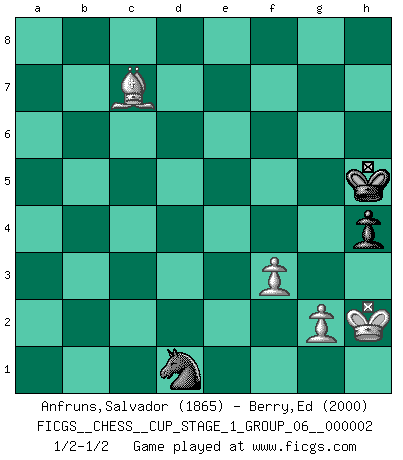 Last move : 1/2-1/2 2018 September 15 0:28:45 [Event "FICGS__CHESS__CUP_STAGE_1_GROUP_06__000002"] [Site "FICGS"] [Date "2018.07.02"] [Round "1"] [White "Anfruns,Salvador"] [Black "Berry,Ed"] [Result "1/2-1/2"] [WhiteElo "1865"] [BlackElo "2000"] 1.e4 e5 2.Nf3 Nf6 3.Nxe5 d6 4.Nf3 Nxe4 5.d4 d5 6.Bd3 Nc6 7.O-O Be7 8.Nbd2 Nd6 9.c3 Bf5 10.Bc2 Bxc2 11.Qxc2 Qd7 12.Qb3 Qf5 13.Re1 a5 14.Ne5 f6 15.Nxc6 bxc6 16.Qa4 Kd7 17.Nb3 Nc4 18.Nd2 Nb6 19.Qd1 Bd6 20.Nf1 g5 21.Ne3 Qg6 22.a4 f5 23.b3 Rae8 24.Bd2 f4 25.Qg4+ Kd8 26.Nf5 h5 27.Qh3 Nc8 28.Nxd6 Nxd6 29.c4 Rxe1+ 30.Rxe1 Re8 31.cxd5 Rxe1+ 32.Bxe1 cxd5 33.Qf3 Qb1 34.Kf1 Ne4 35.Qxh5 Qxb3 36.Qh8+ Ke7 37.h4 Qd3+ 38.Kg1 Qd1 39.Qg7+ Kd8 40.Qf8+ Kd7 41.Qf7+ Kd6 42.Qg6+ Ke7 43.Qg7+ Kd6 44.Qe5+ Kd7 45.Qxd5+ Nd6 46.Qxa5 gxh4 47.Qd2 Qxa4 48.Qxf4 Qa1 49.Qg4+ Kc6 50.Qf3+ Kd7 51.Qh3+ Kc6 52.Qe3 Kd5 53.Qe5+ Kc4 54.Qe6+ Kd3 55.Kf1 Qb2 56.Qe3+ Kc4 57.Qe6+ Kd3 58.Qe3+ Kc4 59.Qe7 Qb7 60.Kg1 Kxd4 61.Ba5 Qb1+ 62.Kh2 Qc1 63.Qxc7 Qf4+ 64.Kg1 Kd5 65.Bb6 Qe4 66.Qc5+ Ke6 67.Qe3 Qxe3 68.Bxe3 Kf5 69.f3 Nf7 70.Bc5 Ne5 71.Bd6 Nc6 72.Kh2 Kg6 73.Bc5 Kh5 74.Kh3 Ne5 75.Bd6 Nd3 76.Bc7 Nf2+ 77.Kh2 Nd1 1/2-1/2 Petrov : Classical attack Kingside Castling by player White (move 7) 10 pieces endgame at move 60 : White KQBPP , Black KQNPP WHITE : King + 1 Queen 1 Bishop 2 Pawns BLACK : King + 1 Queen 1 Knight 2 Pawns 9 pieces endgame at move 63 : White KQBPP , Black KQNP WHITE : King + 1 Queen 1 Bishop 2 Pawns BLACK : King + 1 Queen 1 Knight 1 Pawn 8 pieces endgame at move 67 : White KBPP , Black KQNP WHITE : King + 1 Bishop 2 Pawns BLACK : King + 1 Queen 1 Knight 1 Pawn 7 pieces endgame at move 68 : White KBPP , Black KNP WHITE : King + 1 Bishop 2 Pawns BLACK : King + 1 Knight 1 Pawn This chess game ended in a draw. Follow this game move after move (download)Nowadays, when you're not a grandmaster at 14, you can forget about it. (Anand Viswanathan) Wenn Spassky eine Figur opfert kannst du genauso gut aufgeben. Aber wenn Tal eine Figur opfert, spiel weiter. Er könnte noch eine weitere opfern, und dann ... wer weiß? (Miguel Najdorf) El estómago es una parte esencial del maestro de Ajedrez. (Bent Larsen) Vous savez, camarade Pachman, je n'éprouve pas de plaisir à être ministre, je jouerais plutôt aux échecs comme vous, ou alors ferais une révolution au Venezuela. (Che Guevara à Ludek Pachman, 'Checkmate in Prague', 1975) Information on the Internet is subject to the same rules and regulations as conversation at a bar. (George Lundberg)