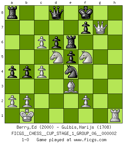 Last move : 1-0 2018 July 25 21:58:54 [Event "FICGS__CHESS__CUP_STAGE_1_GROUP_06__000002"] [Site "FICGS"] [Date "2018.07.02"] [Round "1"] [White "Berry,Ed"] [Black "Gulbis,Harijs"] [Result "1-0"] [WhiteElo "2000"] [BlackElo "1708"] 1.d4 Nf6 2.c4 g6 3.Nc3 Bg7 4.e4 d6 5.h3 O-O 6.Nf3 e5 7.d5 a5 8.Be3 Na6 9.g4 h5 10.Ng5 hxg4 11.hxg4 Bxg4 12.Be2 Bxe2 13.Qxe2 Nc5 14.O-O-O Re8 15.Rh4 a4 16.Kb1 Qe7 17.Rdh1 Nh5 18.Rxh5 gxh5 19.Nf3 c6 20.Nh4 b5 21.dxc6 b4 22.Nd5 Qd8 23.Qxh5 Re6 24.Nf5 Nxe4 25.Qh7+ Kf8 26.Qxg7+ 1-0 King's Indian : Makagonov system (5.h3) Kingside Castling by player Black (move 5) Queenside Castling by player White (move 14) Player White won this chess game. Follow this game move after move (download)Without error there can be no brilliancy. (Emanuel Lasker) Fischer: 'Remis!?' Uhlmann: 'Aber es muss doch dreimal Zugwiederholung sein!' Fischer: 'Sie nehmen das Remis an, wie ich es sage, sonst spiele ich weiter und werde Sie dann schlagen!' (Robert James Fischer) Uno por uno, yo los acribillé, mi superioridad muy pronto se volvio aparente. (Jose Capablanca) Mais l'homme est une créature légère et illogique : semblable au joueur d'échecs, il n'aime que le processus du but à atteindre, non le but lui-même. (Dostoïevsky) The ego is not master in its own house. (Sigmund Freud)