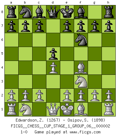 Last move : 1-0 2018 July 7 4:42:7 [Event "FICGS__CHESS__CUP_STAGE_1_GROUP_06__000002"] [Site "FICGS"] [Date "2018.07.02"] [Round "1"] [White "Edwardson,Zachariah"] [Black "Osipov,Sergey"] [Result "1-0"] [WhiteElo "1267"] [BlackElo "1898"] 1.d4 Nf6 2.Nf3 d5 3.Bf4 1-0 Queen's pawn game Player White won this chess game. Follow this game move after move (download)The hardest game to win is a won game. (Emanuel Lasker) Ich bin es gewohnt, das die Jugend mir überhaupt keinen Respekt entgegenbringt. (Alexander Morozewich) La estratégia requiere pensar, la táctica requiere observación. (Max Euwe) Même si vous avez un bon coup à faire, regardez toujours s'il n'y en a pas un qui lui soit préférable. (Pedro Damiano) Inventor: A person who makes an ingenious arrangement of wheels, levers and springs, and believes it civilization. (Ambrose Bierce, The Devil's Dictionary)