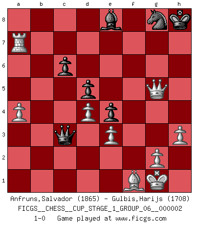 Last move : 1-0 2018 July 17 7:28:13 [Event "FICGS__CHESS__CUP_STAGE_1_GROUP_06__000002"] [Site "FICGS"] [Date "2018.07.02"] [Round "1"] [White "Anfruns,Salvador"] [Black "Gulbis,Harijs"] [Result "1-0"] [WhiteElo "1865"] [BlackElo "1708"] 1.c4 Nf6 2.Nc3 e5 3.Nf3 Nc6 4.e3 Bb4 5.d4 Qe7 6.Be2 O-O 7.O-O Bxc3 8.bxc3 d6 9.Nd2 Bf5 10.Nb3 Ne4 11.Qe1 a5 12.f3 Nf6 13.Qf2 Bg6 14.Re1 e4 15.a4 b6 16.f4 Bh5 17.Bf1 Ng4 18.Qg3 f5 19.Ba3 Qf7 20.Nd2 Rfb8 21.c5 bxc5 22.dxc5 d5 23.Rab1 Rxb1 24.Rxb1 h6 25.Bb5 Nd8 26.c6 Kh7 27.Nb3 Ne6 28.h3 Nf6 29.Qf2 Rg8 30.Nd4 Nxd4 31.cxd4 g5 32.fxg5 Rxg5 33.Bf1 Qe6 34.Rb5 Be8 35.Rxa5 Qxc6 36.Ra6 Qc3 37.Be7 Ng8 38.Bxg5 hxg5 39.Qxf5+ Kh8 40.Qxg5 c6 41.Ra7 1-0 English Opening Kingside Castling by player Black (move 6) Kingside Castling by player White (move 7) Player White won this chess game. Follow this game move after move (download)Chess is played with the mind and not with the hands ! (Renaud and Kahn) Ich verstehe Aljechins Kombinationen ganz gut; aber woher er diese Angriffschancen bekommt und wie er die Eröffnung behandelt das ist für mich ein Buch mit sieben Siegeln. (Rudolf Spielmann) No solamente yo pronostico su triunfo sobre Botvinnik, sino que me adelanto y digo que probablemente Fischer es el jugador de Ajedrez mas grande que haya existido. (John Collins) Il n'y a pas eu de défaite parce que je ne crois pas que cet ordinateur ait jamais existé. IBM a triché en refusant d'imprimer les modes de recherche de la machine. C'est évident, pendant le match, des coups décisifs ont été joués par des êtres humains. Aujourd'hui, les meilleurs spécialistes en informatique ne peuvent toujours pas expliquer comment Deep-Blue a pu jouer contre la logique des ordinateurs. IBM a gagné une guerre de communication, mais ils sont incapables de prouver que l'ordinateur a gagné tout seul. (Garry Kasparov) I believe in luck. How else can you explain the success of those you dislike ? (Jean Cocteau)