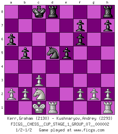 Last move : 1/2-1/2 2018 August 17 1:17:55 [Event "FICGS__CHESS__CUP_STAGE_1_GROUP_07__000002"] [Site "FICGS"] [Date "2018.07.02"] [Round "1"] [White "Kerr,Graham"] [Black "Kushnaryov,Andrey"] [Result "1/2-1/2"] [WhiteElo "2130"] [BlackElo "2293"] 1.e4 c5 2.Nf3 Nc6 3.d4 cxd4 4.Nxd4 Nf6 5.Nc3 e5 6.Ndb5 d6 7.Bg5 a6 8.Na3 b5 9.Nd5 Be7 10.Bxf6 Bxf6 11.c3 Ne7 12.Nxf6+ gxf6 13.Nc2 Bb7 14.Bd3 d5 15.Qe2 dxe4 16.Bxe4 Bxe4 17.Qxe4 Qd5 18.Qxd5 Nxd5 19.O-O-O O-O-O 1/2-1/2 Sicilian : Pelikan (Lasker/Sveshnikov) variation Queenside Castling by player White (move 19) Queenside Castling by player Black (move 19) This chess game ended in a draw. Follow this game move after move (download)If a ruler does not understand Chess, how can he rule over a kingdom ? (King Khusros II) Die Idee von Capablanca, Schach als Fach in den Schulen zu lehren, ist großartig. (Fidel Castro) No soy una persona materialista y por eso, no resiento la falta o pérdida del dinero. La ausencia de cosas mundanas carece de importancia. Ya que el Ajedrez es una forma en la que puedo ser tan materialista como yo desee sin tener la necesidad de vender mi alma. (Jamie Walter Adams) Le temps de noter son nom sur la feuille de partie, j'étais déjà en zeitnot ! D'un modeste amateur apparié lors de la première ronde d'un open contre le grand-maître Azmaïparashvili. The question of whether computers can think is just like question of whether submarines can swim. (Edsger W. Dijkstra)