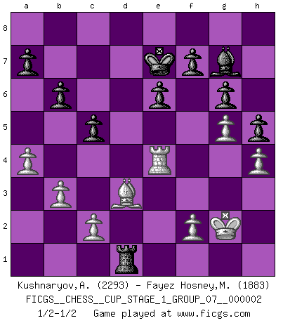 Last move : 1/2-1/2 2018 November 6 23:57:14 [Event "FICGS__CHESS__CUP_STAGE_1_GROUP_07__000002"] [Site "FICGS"] [Date "2018.07.02"] [Round "1"] [White "Kushnaryov,Andrey"] [Black "Fayez Hosney,Mohammed"] [Result "1/2-1/2"] [WhiteElo "2293"] [BlackElo "1883"] 1.d4 g6 2.e4 Bg7 3.Nf3 c6 4.Nc3 d5 5.h3 Nf6 6.e5 Ne4 7.Nxe4 dxe4 8.Ng5 c5 9.Bc4 O-O 10.b3 Nc6 11.O-O Qxd4 12.Bf4 Qxd1 13.Raxd1 Nxe5 14.Bxe5 Bxe5 15.Nxe4 b6 16.Rfe1 Bg7 17.g4 e6 18.a4 Rb8 19.Nd6 Rd8 20.Rd3 Bb7 21.Nb5 Rxd3 22.Bxd3 Ra8 23.Nd6 Bd5 24.Bc4 Rd8 25.Bxd5 Rxd6 26.Bf3 Rd2 27.Re2 Rd1+ 28.Kg2 Rc1 29.h4 h6 30.g5 Bd4 31.Be4 Kg7 32.Bd3 Bc3 33.Bb5 h5 34.Bd3 Kf8 35.Re4 Ke7 36.Re2 Rd1 37.Re4 Bd4 38.Bc4 Bg7 39.Bd3 1/2-1/2 Modern defense Kingside Castling by player Black (move 9) Kingside Castling by player White (move 11) This chess game ended in a draw. Follow this game move after move (download)Fischer was a master of clarity and a king of artful positioning. His opponents would see where he was going but were powerless to stop him. (Bruce Pandolfini) Wenn ein Kopf und ein Buch zusammenstoßen und es klingt hohl, ist es denn allemal im Buche? (Georg Christoph Lichtenberg) Hay jugadores fuertes y personas amables y yo soy un jugador fuerte. (Bobby Fischer) Votre prénom est 'Tactique', votre deuxième prénom est 'Tactique' et votre nom est 'Tactique'. (Ken Smith) The message for business people contemplating their place in the cyberspace is simple and direct: get linked or get lost. (Vic Sussman and Kenan Pollack)