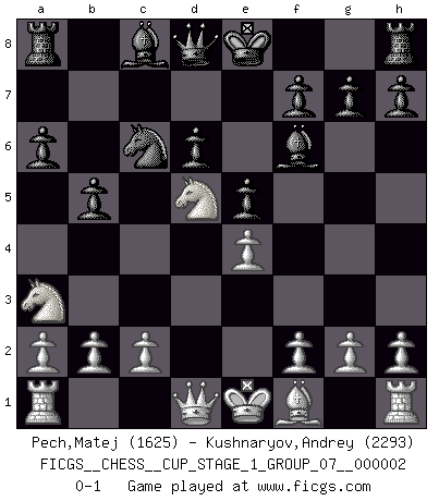 Last move : 0-1 2018 August 23 5:21:20 [Event "FICGS__CHESS__CUP_STAGE_1_GROUP_07__000002"] [Site "FICGS"] [Date "2018.07.02"] [Round "1"] [White "Pech,Matej"] [Black "Kushnaryov,Andrey"] [Result "0-1"] [WhiteElo "1625"] [BlackElo "2293"] 1.e4 c5 2.Nf3 Nc6 3.d4 cxd4 4.Nxd4 Nf6 5.Nc3 e5 6.Ndb5 d6 7.Bg5 a6 8.Na3 b5 9.Nd5 Be7 10.Bxf6 Bxf6 0-1 Sicilian : Pelikan (Lasker/Sveshnikov) variation Player Black won this chess game. Follow this game move after move (download)We like to think. (Gary Kasparov) Später, ... hatte ich zunehmend Erfolg in entscheidenden Partien. Vielleicht weil ich eine einfache Wahrheit erkannte: nicht nur ich hatte Angst, auch mein Gegner. (Mikhail Nekhemyevich Tal) El Ajedrez es como la guerra en un tablero. (Bobby Fischer) Si le désir cupide (et stupide) de gagner est une inépuisable source de souffrance, une combinaison brillante sur l'échiquier est une découverte : le coquelicot qui s'épanouit lorsque apparaît la Voie Lactée. (Arrabal) Luck never gives; it only lends. (Swedish proverb)
