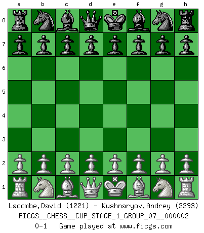 Last move : 0-1 2018 August 1 8:51:39 [Event "FICGS__CHESS__CUP_STAGE_1_GROUP_07__000002"] [Site "FICGS"] [Date "2018.07.02"] [Round "1"] [White "Lacombe,David"] [Black "Kushnaryov,Andrey"] [Result "0-1"] [WhiteElo "1221"] [BlackElo "2293"] 0-1 This chess game has been lost on time (started : 2018.07.02 2:46:16) Player Black won this chess game. Follow this game move after move (download)Chess is 99 percent tactics. (Teichmann) Ich verlor meine Bürgerrechte, mein Gehalt wurde mir nicht mehr bezahlt und ich wurde zensiert und durfte nicht mehr ins Ausland reisen. [nach dem Match Fischer-Taimanov 6:0] (Mark Taimanov) No solamente yo pronostico su triunfo sobre Botvinnik, sino que me adelanto y digo que probablemente Fischer es el jugador de Ajedrez mas grande que haya existido. (John Collins) Je menace de comprendre la position. (Anonyme) The best weapon against an enemy is another enemy. (Friedrich Nietzsche)