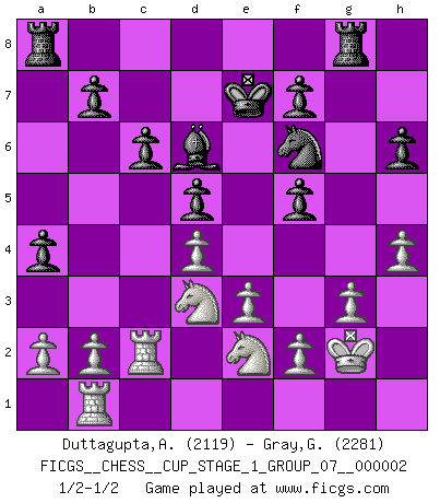 Last move : 1/2-1/2 2018 November 20 10:19:56 [Event "FICGS__CHESS__CUP_STAGE_1_GROUP_07__000002"] [Site "FICGS"] [Date "2018.07.02"] [Round "1"] [White "Duttagupta,Aniruddha"] [Black "Gray,Garvin"] [Result "1/2-1/2"] [WhiteElo "2119"] [BlackElo "2281"] 1.d4 d5 2.c4 e6 3.Nc3 Nf6 4.cxd5 exd5 5.Bg5 c6 6.e3 h6 7.Bh4 Bf5 8.Qf3 Bh7 9.Bxf6 Qxf6 10.Qxf6 gxf6 11.Kd2 Nd7 12.Bd3 Bxd3 13.Kxd3 Rg8 14.g3 f5 15.Nf3 Be7 16.Ke2 a5 17.Na4 Kf8 18.Rac1 Re8 19.Nd2 Ra8 20.Nb3 Nf6 21.Kf1 Bd6 22.Nbc5 Rb8 23.Rc2 Ke7 24.Nd3 Ne4 25.Rg1 Kd7 26.Nc3 Ra8 27.Ne2 Rh8 28.Kg2 a4 29.Re1 Rhg8 30.Rd1 Ke7 31.Ng1 Kf6 32.Ne2 Rge8 33.h4 Rg8 34.Rb1 Ke7 35.Ndf4 Nf6 36.Nd3 1/2-1/2 QGD : Exchange, positional line, 5...c6 This chess game ended in a draw. Follow this game move after move (download)The older I grow, the more I value Pawns. (Keres) Die Jungen erwarten, dass Opa einfach umfällt. Dann aber kann Opa fünf Stunden lang Schach spielen und die jungen Gegner an die Wand drücken. (Viktor Kortschnoi) En manos de Fischer's, una diminuta ventaja teórica es tan buena como tener una Reina de ventaja. (Isaac Kashdan) Vous n'êtes pas toujours obligé de jouer le meilleur coup. Un coup doit être actif, entreprenant, correct et beau ! (David Bronstein) Wawaweewa ! (Borat: Cultural learnings of America for make benefit glorious nation of Kazakhstan)
