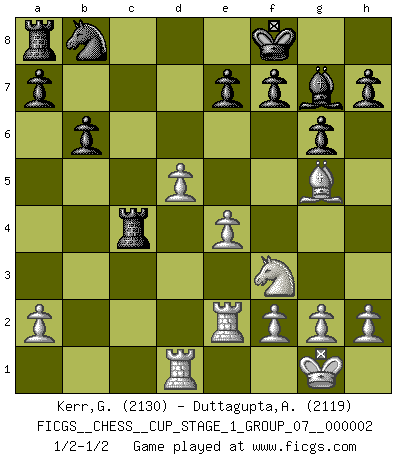 Last move : 1/2-1/2 2018 August 22 20:46:15 [Event "FICGS__CHESS__CUP_STAGE_1_GROUP_07__000002"] [Site "FICGS"] [Date "2018.07.02"] [Round "1"] [White "Kerr,Graham"] [Black "Duttagupta,Aniruddha"] [Result "1/2-1/2"] [WhiteElo "2130"] [BlackElo "2119"] 1.d4 Nf6 2.c4 g6 3.Nc3 d5 4.cxd5 Nxd5 5.e4 Nxc3 6.bxc3 Bg7 7.Nf3 c5 8.Rb1 O-O 9.Be2 cxd4 10.cxd4 Qa5+ 11.Qd2 Qxd2+ 12.Bxd2 b6 13.O-O Bb7 14.d5 Ba6 15.Rfe1 Bxe2 16.Rxe2 Rc8 17.Bg5 Kf8 18.Rd1 Rc4 1/2-1/2 King's Indian defense, 3.Nc3 Kingside Castling by player Black (move 8) Kingside Castling by player White (move 13) This chess game ended in a draw. Follow this game move after move (download)Only the player with the initiative has the right to attack. (Wilhelm Steinitz) Wie gewinnt Tal? Er entwickelt alle seine Figuren in die Brettmitte und opfert sie dann irgendwo. (Robert James Fischer) Tu sabes, camarada Pachman, no disfruto el ser un Ministro, preferería jugar al Ajedrez como tu. (Che Guevara) Lorsque vous vous retrouvez devant une position atroce, ne tendez pas un ultime piège dérisoire avec l'intention d'abandonner si l'adversaire le déjoue ! Faites-vous plutôt un devoir de résister comme si votre vie en dépendait. Jouez le coup qui vous déplairait au centuple si vous étiez dans la peau de votre tortionnaire ! Have no fear of perfection - you'll never reach it. (Salvador Dali)