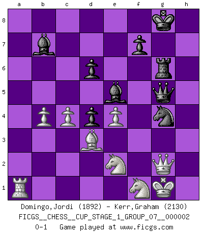 Last move : 0-1 2018 December 12 1:22:28 [Event "FICGS__CHESS__CUP_STAGE_1_GROUP_07__000002"] [Site "FICGS"] [Date "2018.07.02"] [Round "1"] [White "Domingo,Jordi"] [Black "Kerr,Graham"] [Result "0-1"] [WhiteElo "1892"] [BlackElo "2130"] 1.e4 c5 2.Nf3 d6 3.c3 Nf6 4.Be2 g6 5.O-O Bg7 6.Bb5+ Nc6 7.Re1 O-O 8.h3 e5 9.d3 Bd7 10.Be3 Rb8 11.a4 a6 12.Bc4 b5 13.axb5 axb5 14.Bb3 Qc7 15.Nbd2 Ra8 16.Qe2 h6 17.Red1 Rxa1 18.Rxa1 Ne7 19.Qe1 Rd8 20.c4 b4 21.Ba4 Bc8 22.Nf1 Nh5 23.Ng3 Nf4 24.Qd2 Kh7 25.Bxf4 exf4 26.Ne2 g5 27.d4 Ng6 28.Bc2 Kg8 29.Bd3 Qe7 30.Nh2 Re8 31.f3 h5 32.b3 cxd4 33.Qxb4 Ne5 34.Nc1 g4 35.hxg4 hxg4 36.fxg4 f3 37.Qd2 fxg2 38.Qxg2 Qg5 39.Nf1 Bb7 40.Qg3 Re6 41.b4 Nxg4 42.Ne2 Be5 43.Qg2 Rg6 0-1 This chess game has been lost on time (started : 2018.07.02 2:46:16) Graham Kerr gg, thanks ;-) Sicilian Kingside Castling by player White (move 5) Kingside Castling by player Black (move 7) Player Black won this chess game. Follow this game move after move (download)When I have White, I win because I am white; When I have Black, I win because I am Bogolyubov. (Bogolyubov) Der Traum, für den ich lebe, ist der von einem freien Russland. Viele mögen sagen: Russland hat doch ein Parlament, einen gewählten Präsidenten. Aber ich spüre, dass in meiner Heimat die Angst wiederkehrt. Eine Angst, sich frei zu äußern, bestimmte Dinge zu tun (Garry Kasparov) El Ajedrez es como la guerra en un tablero. (Bobby Fischer) Vouloir jouer aux échecs contre soi-même est aussi paradoxal que vouloir marcher sur son ombre. (Stefan Zweig) It's not the size of the dog in the fight, it's the size of the fight in the dog. (Mark Twain)