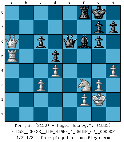 Last move : 1/2-1/2 2018 December 15 13:36:25 [Event "FICGS__CHESS__CUP_STAGE_1_GROUP_07__000002"] [Site "FICGS"] [Date "2018.07.02"] [Round "1"] [White "Kerr,Graham"] [Black "Fayez Hosney,Mohammed"] [Result "1/2-1/2"] [WhiteElo "2130"] [BlackElo "1883"] 1.e4 e5 2.Nf3 Nf6 3.Nxe5 d6 4.Nf3 Nxe4 5.d4 d5 6.Bd3 Nc6 7.O-O Be7 8.Nbd2 Nxd2 9.Bxd2 Bg4 10.c3 O-O 11.h3 Bh5 12.g3 Qd7 13.Kg2 Bg6 14.Bxg6 fxg6 15.Qe2 Rae8 16.Qd3 Bf6 17.Rae1 Nd8 18.b4 c6 19.a4 a6 20.h4 Nf7 21.Bf4 Rxe1 22.Rxe1 Re8 23.Ra1 Nd8 24.b5 Ne6 25.Be3 axb5 26.axb5 Nc7 27.bxc6 bxc6 28.Ra7 Qc8 29.Bf4 Nb5 30.Ra4 Qe6 31.Be5 Nd6 32.Bxd6 Qxd6 33.Ra5 Qe6 34.Qb1 Rc8 35.Ra6 Rf8 36.Qe1 Qd7 37.Qb1 Qe6 38.Qd3 Re8 39.Ra5 Bd8 40.Ra8 Bf6 41.Ra4 Qd7 42.Ra1 Qe6 43.Qb1 Rf8 44.Qd3 Re8 45.Qa6 Rf8 46.Re1 Qd7 47.Re2 Re8 48.Ra2 Qe6 49.Ra5 Rf8 1/2-1/2 Petrov : Classical attack Kingside Castling by player White (move 7) Kingside Castling by player Black (move 10) This chess game ended in a draw. Follow this game move after move (download)A great player and a great example for many. His book My 60 Memorable Games had a big impact on me. It is a shame he didn't continue to enrich the world of chess with his unparalleled understanding after 1972. (Jan Timman, about Bobby Fischer's death) Ja, ich habe einmal eine Blitzpartie gespielt, es war in einem Zug, 1929. --im Interview 1989 (Mikhail Moiseyevich Botvinik) El Ajedrez moderno está demasiado preocupado con cosas como la estructura de Peones. Olvidenlo, el Jaque Mate termina la partida. (Nigel Short) Les échecs, c'est l'art d'analyser. (Mikhail Botvinnik) Memory... is the diary that we all carry with us. (Oscar Wilde, The Importance of Being Earnest)