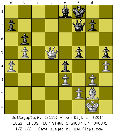 Last move : 1/2-1/2 2018 October 27 9:2:3 [Event "FICGS__CHESS__CUP_STAGE_1_GROUP_07__000002"] [Site "FICGS"] [Date "2018.07.02"] [Round "1"] [White "Duttagupta,Aniruddha"] [Black "van Dijk,Erik L."] [Result "1/2-1/2"] [WhiteElo "2119"] [BlackElo "2014"] 1.c4 e5 2.Nc3 Nf6 3.Nf3 Nc6 4.g3 Bb4 5.Bg2 O-O 6.O-O Re8 7.Nd5 Bc5 8.d3 h6 9.Nd2 Nxd5 10.cxd5 Ne7 11.Nc4 d6 12.Be3 Bxe3 13.Nxe3 c6 14.Rc1 Bd7 15.Qd2 Rc8 16.b4 cxd5 17.Nxd5 Nxd5 18.Bxd5 Rxc1 19.Rxc1 Qb8 20.h4 Rc8 21.d4 b6 22.dxe5 Rxc1+ 23.Qxc1 dxe5 24.Qc4 Be8 25.a4 Kf8 26.b5 Qd8 27.Bf3 f5 28.Qe6 Qf6 29.Qd5 e4 30.Bg2 h5 31.e3 Qf7 1/2-1/2 English Opening Kingside Castling by player Black (move 5) Kingside Castling by player White (move 6) This chess game ended in a draw. Follow this game move after move (download)He who takes the Queen's Knight's Pawn will sleep in the streets. (Anonymous) Über Karpov: Er war und ist ein Vertreter der russischen Reaktionäre. Das steckt tief in seiner Seele, wehalb ich nicht nett mit ihm umgehen kann. (Viktor Kortschnoi) La pasion por jugar al Ajedrez es una de las mas inexplicables en el mundo. (H.G. Wells) Si le désir cupide (et stupide) de gagner est une inépuisable source de souffrance, une combinaison brillante sur l'échiquier est une découverte : le coquelicot qui s'épanouit lorsque apparaît la Voie Lactée. (Arrabal) The faster the computer, the slower the brain. (Thibault de Vassal)