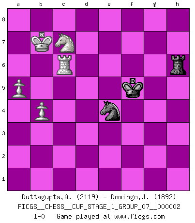 Last move : 1-0 2018 December 21 2:14:39 [Event "FICGS__CHESS__CUP_STAGE_1_GROUP_07__000002"] [Site "FICGS"] [Date "2018.07.02"] [Round "1"] [White "Duttagupta,Aniruddha"] [Black "Domingo,Jordi"] [Result "1-0"] [WhiteElo "2119"] [BlackElo "1892"] 1.d4 d5 2.c4 dxc4 3.e4 e5 4.Nf3 exd4 5.Bxc4 Nc6 6.O-O Be6 7.Bb5 Bc5 8.b4 Bb6 9.a4 a6 10.Bxc6+ bxc6 11.a5 Ba7 12.Bb2 Nf6 13.Bxd4 Nxe4 14.Bxa7 Qxd1 15.Rxd1 Rxa7 16.Ne5 Bd5 17.f3 Nf6 18.Re1 O-O 19.Nc3 Re8 20.Nxd5 cxd5 21.Nc6 R7a8 22.Rxe8+ Nxe8 23.Rd1 Nd6 24.Ne7+ Kf8 25.Nxd5 Nb5 26.Rc1 Ra7 27.Kf2 Ke8 28.Nf4 Kd7 29.Nd3 Nd4 30.Ke3 Nc6 31.Ke4 Kd6 32.Rd1 Ke6 33.g4 h6 34.h4 Kf6 35.Kd5 Ne7+ 36.Kc5 Rb7 37.Re1 g5 38.f4 c6 39.hxg5+ hxg5 40.Kd6 Ng6 41.fxg5+ Kxg5 42.Re4 f5 43.gxf5 Kxf5 44.Nc5 Rh7 45.Re1 Rh6 46.Kxc6 Nf4 47.Kb7 Nd5 48.Nxa6 Rh4 49.Rb1 Nc3 50.Rc1 Ne4 51.Nc7 Rh6 52.Rc6 1-0 This chess game has been lost on time (started : 2018.07.02 2:46:16) QGA : 3.e4 Kingside Castling by player White (move 6) Kingside Castling by player Black (move 18) 10 pieces endgame at move 43 : White KRNPP , Black KRNPP WHITE : King + 1 Rook 1 Knight 2 Pawns BLACK : King + 1 Rook 1 Knight 2 Pawns 9 pieces endgame at move 46 : White KRNPP , Black KRNP WHITE : King + 1 Rook 1 Knight 2 Pawns BLACK : King + 1 Rook 1 Knight 1 Pawn 8 pieces endgame at move 48 : White KRNPP , Black KRN WHITE : King + 1 Rook 1 Knight 2 Pawns BLACK : King + 1 Rook 1 Knight Player White won this chess game. Follow this game move after move (download)No price is too great for the scalp of the enemy King. (Koblentz) Im Internet Chess Club betrug mein Rating vorübergehend 3350 ELO-Punkte. (Sergej Karjakin) Alguna parte de un error es siempre correcto. (Savielly Tartakover) Le jeu d'échecs fait naître et fortifie en nous plusieurs qualités précieuses dans le cours de l'existence, telles que la prévoyance, la circonspection, la prudence, et la persévérance. (Benjamin Franklin - 1783, la morale des échecs) All battles are fought by scared men who'd rather be someplace else. (John Wayne in the movie In harm's way)