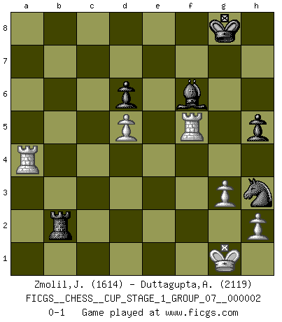 Last move : 0-1 2018 December 2 23:53:44 [Event "FICGS__CHESS__CUP_STAGE_1_GROUP_07__000002"] [Site "FICGS"] [Date "2018.07.02"] [Round "1"] [White "Zmolil,Josef"] [Black "Duttagupta,Aniruddha"] [Result "0-1"] [WhiteElo "1614"] [BlackElo "2119"] 1.d4 Nf6 2.c4 e6 3.Nc3 c5 4.d5 exd5 5.cxd5 d6 6.e4 g6 7.Nf3 a6 8.a4 Bg4 9.Be2 Bxf3 10.Bxf3 Nbd7 11.O-O Bg7 12.Bf4 Qe7 13.Re1 O-O 14.Qd2 Rab8 15.a5 b5 16.axb6 Rxb6 17.Ra2 Rfb8 18.Bg5 Rb4 19.Qc2 c4 20.Nd1 Nc5 21.Bd2 R4b5 22.Qxc4 Nfd7 23.Qc2 Nb3 24.Be3 Ndc5 25.Be2 Rb4 26.Nc3 a5 27.g3 Nxe4 28.Nxe4 Rxe4 29.Bd3 Re5 30.Rd1 h5 31.Ra3 Rxe3 32.fxe3 Nc5 33.Bxg6 fxg6 34.Qxg6 Rxb2 35.Rf1 Qe5 36.Rxa5 Qxe3+ 37.Kh1 Qe4+ 38.Qxe4 Nxe4 39.Rf5 Bf6 40.Ra4 Nf2+ 41.Kg1 Nh3+ 0-1 Queen's pawn game Kingside Castling by player White (move 11) Kingside Castling by player Black (move 13) Player Black won this chess game. Follow this game move after move (download)Every Chess master was once a beginner. (Chernev) Kostenjuk hat keinen Sexappeal. (Loek van Wely) Puntos débiles o agujeros en la posición de tu oponente deben de ser ocupados por piezas, no Peones. (Siegbert Tarrasch) On peut tirer plus d'utilité d'une partie perdue que de 100 parties gagnées. (Capablanca) I don't diet. I just don't eat as much as I'd like to. (Linda Evangelista, supermodel)