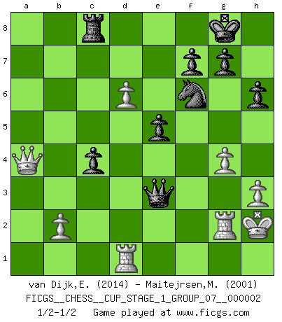 Last move : 1/2-1/2 2018 September 28 1:21:41 [Event "FICGS__CHESS__CUP_STAGE_1_GROUP_07__000002"] [Site "FICGS"] [Date "2018.07.02"] [Round "1"] [White "van Dijk,Erik L."] [Black "Maitejrsen,Maite"] [Result "1/2-1/2"] [WhiteElo "2014"] [BlackElo "2001"] 1.e4 e5 2.Nc3 Nc6 3.g3 Nf6 4.Bg2 Bc5 5.d3 a5 6.h3 O-O 7.Nge2 d6 8.O-O Rb8 9.a4 Re8 10.Kh2 h6 11.f4 Nb4 12.Nb1 c6 13.c3 Na6 14.Nd2 Be3 15.Nc4 Bxc1 16.Qxc1 Nc5 17.Qc2 Ra8 18.Nd2 Qc7 19.d4 Ncd7 20.Rf2 b5 21.axb5 cxb5 22.g4 Bb7 23.fxe5 dxe5 24.d5 Qb6 25.Raf1 a4 26.Ng3 Ba6 27.Qd1 Nh7 28.Nf5 Ndf8 29.d6 Ra7 30.c4 Rd7 31.Qc2 Ne6 32.Nb1 bxc4 33.Nc3 Nf4 34.Qxa4 Nf6 35.Ne7+ Rdxe7 36.dxe7 Rxe7 37.Rc2 Bb7 38.Re1 Re8 39.Nd5 Bxd5 40.exd5 Rc8 41.Rd1 Nxg2 42.Rxg2 Qe3 43.d6 Qf4+ 44.Kg1 Qe3+ 45.Kh2 Qf4+ 46.Kg1 Qe3+ 47.Kh2 1/2-1/2 Vienna : Paulsen variation Kingside Castling by player Black (move 6) Kingside Castling by player White (move 8) This chess game ended in a draw. Follow this game move after move (download)There just isn't enough televised Chess. (David Letterman) Im Wettkampf zwischen starken Meistern kommen Fehler sehr selten vor, deshalb ist es mit bloßem Warten nicht getan. (José Raúl Capablanca) La táctica fluye a partir de una posición superior. (Bobby Fischer) Les écrivains ont utilisé les échecs pour analyser les côtés extrêmes de la nature humaine. Dans ce cadre, les échecs offrent un champ d'expérimentation idéal. Mais on pourrait faire la même chose avec la peinture. Et là, en vous référant à Van Gogh, vous ne tirerez pas de conclusion définitive sur les peintres. (Gary Kasparov) Every man's memory is his private literature. (Aldous Huxley)