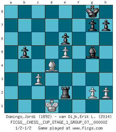 Last move : 1/2-1/2 2018 October 22 18:15:9 [Event "FICGS__CHESS__CUP_STAGE_1_GROUP_07__000002"] [Site "FICGS"] [Date "2018.07.02"] [Round "1"] [White "Domingo,Jordi"] [Black "van Dijk,Erik L."] [Result "1/2-1/2"] [WhiteElo "1892"] [BlackElo "2014"] 1.e4 e6 2.d4 d5 3.Nc3 Nf6 4.e5 Nfd7 5.f4 c5 6.Nf3 Nc6 7.Be3 Be7 8.Qd2 O-O 9.dxc5 Nxc5 10.O-O-O b6 11.Bb5 Bb7 12.Bxc6 Bxc6 13.Nd4 Rc8 14.f5 b5 15.fxe6 fxe6 16.b4 Ne4 17.Nxc6 Rxc6 18.Nxe4 dxe4 19.Qxd8 Rxd8 20.Rxd8+ Bxd8 21.Bxa7 Bg5+ 22.Kd1 Ra6 23.Bd4 Ra4 24.Re1 Rxb4 25.Rxe4 Ra4 26.c3 Rxa2 27.Re2 Rxe2 1/2-1/2 French : Steinitz, Boleslavsky variation Kingside Castling by player Black (move 8) Queenside Castling by player White (move 10) This chess game ended in a draw. Follow this game move after move (download)Bobby Fischer's current state of mind is indeed a tragedy. One of the world's greatest Chess players - the pride and sorrow of American Chess. (Frank Brady) Du musst nicht gut spielen, es reicht, wenn du besser spielst als dein Gegner. (Anonymous) Todos los Maestros de Ajedrez fueron un día unos principiantes. (Chernev) Il a essayé de se convaincre qu'il pourrait empêcher toutes les erreurs et ne jamais perdre. L'horreur ! Gary Kasparov au sujet de Robert Fischer. He who fights with monsters should be careful lest he thereby become a monster. (Friedrich Nietzsche, Beyond Good and Evil)