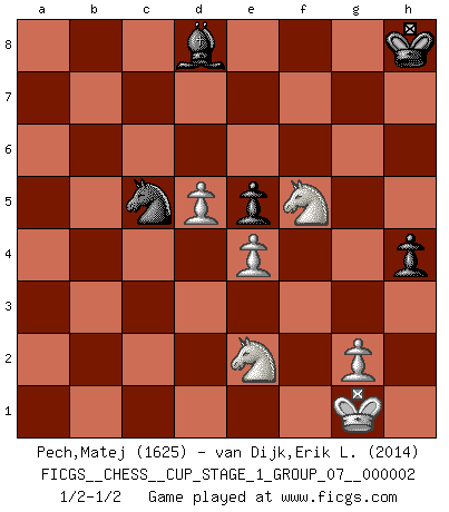 Last move : 1/2-1/2 2018 November 20 9:44:47 [Event "FICGS__CHESS__CUP_STAGE_1_GROUP_07__000002"] [Site "FICGS"] [Date "2018.07.02"] [Round "1"] [White "Pech,Matej"] [Black "van Dijk,Erik L."] [Result "1/2-1/2"] [WhiteElo "1625"] [BlackElo "2014"] 1.d4 Nf6 2.c4 c5 3.d5 e5 4.Nc3 d6 5.e4 Be7 6.Bd3 Nbd7 7.Nge2 h5 8.h3 h4 9.O-O Nh5 10.Bd2 g5 11.Qa4 Rg8 12.Kh1 a6 13.Rab1 Kf8 14.Qc2 g4 15.hxg4 Rxg4 16.Ng1 Nf4 17.Bxf4 Rxf4 18.a3 Nf6 19.Nd1 b5 20.Ne3 bxc4 21.Nxc4 a5 22.b4 axb4 23.axb4 cxb4 24.Ne2 Rg4 25.Rxb4 Rg6 26.Rfb1 Kg7 27.Ne3 Ng4 28.Rb8 Rxb8 29.Rxb8 Nxf2+ 30.Kh2 Bg5 31.Rxc8 Qb6 32.Nf5+ Kh7 33.Qc7 Ng4+ 34.Kh1 Nf2+ 35.Kg1 Qxc7 36.Rxc7 Nxd3 37.Rxf7+ Kh8 38.Rd7 Nc5 39.Rxd6 Rxd6 40.Nxd6 Be7 41.Nf5 Bd8 1/2-1/2 Czech Benoni defense Kingside Castling by player White (move 9) This chess game ended in a draw. Follow this game move after move (download)If Chess is a science, it's a most inexact one. If Chess is an art, it is too exacting to be seen as one. If Chess is a sport, it's too esoteric. If Chess is a game, it's too demanding to be just a game. If Chess is a mistress, she's a demanding one. If Chess is a passion, it's a rewarding one. If Chess is life, it's a sad one. (Unknown) Versuche, dich von der Sklaverei der Eröffnungsvarianten zu befreien. Stattdessen soll man gewisse Typenpositionen erlernen, die man eingehend analysiert. (Aaron Nimzowitsch) El Ajedrez se juega con la mente... ¡no con las manos!. (Renaud y Kahn) La vie et les Echecs sont tous les deux une lutte constante. (Lasker) The Internet isn't free. It just has an economy that makes no sense to capitalism. (Brad Shapcott)