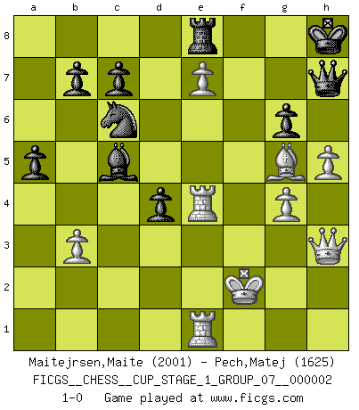 Last move : 1-0 2018 September 22 15:4:4 [Event "FICGS__CHESS__CUP_STAGE_1_GROUP_07__000002"] [Site "FICGS"] [Date "2018.07.02"] [Round "1"] [White "Maitejrsen,Maite"] [Black "Pech,Matej"] [Result "1-0"] [WhiteElo "2001"] [BlackElo "1625"] 1.b3 e5 2.Bb2 Nc6 3.e3 Nf6 4.c4 d5 5.cxd5 Nxd5 6.a3 Bd6 7.d3 O-O 8.Nf3 Qe7 9.Be2 f5 10.O-O a5 11.Nbd2 f4 12.e4 Nb6 13.Re1 Bg4 14.d4 exd4 15.h3 Bxf3 16.Nxf3 Nd7 17.Bb5 Nde5 18.Bxc6 Nxc6 19.e5 Bc5 20.Qd3 Rad8 21.Qc4+ Kh8 22.Re4 Bb6 23.Rae1 Qc5 24.Qd3 Rf5 25.e6 Qe7 26.Bc1 Rdf8 27.Bd2 Qxa3 28.e7 Re8 29.Ng5 g6 30.Bxf4 Qb4 31.Bd2 Qc5 32.h4 Qd5 33.g4 Rf6 34.h5 Bc5 35.Qh3 Qg8 36.Nxh7 Qxh7 37.Bg5 Rxf2 38.Kxf2 1-0 This chess game has been lost on time (started : 2018.07.02 2:46:16) Nimzovich-Larsen attack : Modern variation Kingside Castling by player Black (move 7) Kingside Castling by player White (move 10) Player White won this chess game. Follow this game move after move (download)If you aren't afraid of Spassky, then I have removed the element of money. (Jim Slater) Wenn Du einsam bist, wenn Du Dich in der Welt wie ein Fremder fühlst, spiele Schach. Das wird Deinen Geist erheben und Dein Ratgeber im Kampf sein. (Aristoteles) La pasion por jugar al Ajedrez es una de las mas inexplicables en el mundo. (H.G. Wells) Les échecs sont plus proches de l'art de l'assassinat que de l'art de la guerre. (Arturo Perez-Reverte) Programming can only do so much before it becomes too much. (Don Groves)