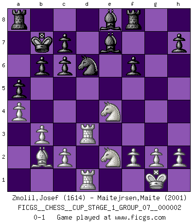 Last move : 0-1 2018 August 31 20:55:4 [Event "FICGS__CHESS__CUP_STAGE_1_GROUP_07__000002"] [Site "FICGS"] [Date "2018.07.02"] [Round "1"] [White "Zmolil,Josef"] [Black "Maitejrsen,Maite"] [Result "0-1"] [WhiteElo "1614"] [BlackElo "2001"] 1.e4 e5 2.Nf3 Nc6 3.Bb5 Nf6 4.O-O Nxe4 5.d4 Nd6 6.Bxc6 dxc6 7.dxe5 Nf5 8.Qxd8+ Kxd8 9.Nc3 Bd7 10.Rd1 Kc8 11.Ng5 Be8 12.b3 Be7 13.Nge4 a5 14.a4 b6 15.Rd3 Kb7 16.Bb2 Rf8 17.Rad1 f6 18.exf6 gxf6 19.Ne2 Nd6 0-1 Ruy Lopez : Berlin defense, Open variation Kingside Castling by player White (move 4) Player Black won this chess game. Follow this game move after move (download)Place the contents of the Chess box in a hat, shake them up vigorously, pour them on the board from a height of two feet, and you get the style of Steinitz. (H. E. Bird) Spiel ein langweiliges Spiel zu Ende und lustige Dinge können passieren. (Hans Ree) Coloca el contenido de las piezas del Ajedrez en un sombrero, agitalo vigorosamente, arrojalas en un tablero desde una altura de 30 centimetros y así obtendras el estilo de Steinitz. (H. E. Bird) On entre au jeu d'Echecs comme on entre en Religion. Pour le joueur d'Echecs, la partie d'Echecs c'est l'office, la messe, le défilé du 1er Mai, le dépôt de gerbe au Monument aux Morts. C'est un drame sacré. (Michel Roos) Optimism is a variety of information deficit. Sometimes especially true for correspondence chess games. (Michael Aigner)