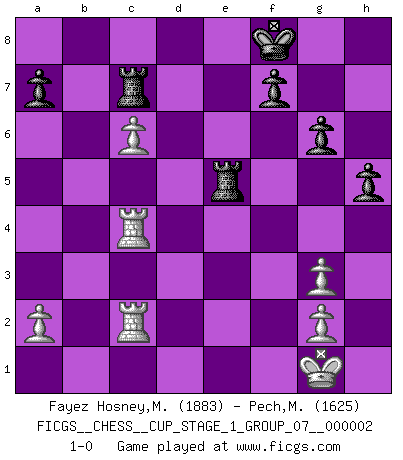 Last move : 1-0 2018 November 5 2:38:0 [Event "FICGS__CHESS__CUP_STAGE_1_GROUP_07__000002"] [Site "FICGS"] [Date "2018.07.02"] [Round "1"] [White "Fayez Hosney,Mohammed"] [Black "Pech,Matej"] [Result "1-0"] [WhiteElo "1883"] [BlackElo "1625"] 1.f4 d5 2.Nf3 g6 3.e3 Bg7 4.Be2 Nf6 5.O-O O-O 6.d3 c5 7.Qe1 Nc6 8.c3 Re8 9.Nbd2 e5 10.Nxe5 Nxe5 11.fxe5 Rxe5 12.Nb3 b6 13.d4 Re8 14.dxc5 bxc5 15.Nxc5 Rb8 16.b4 Bf5 17.Bd2 Ne4 18.Nxe4 Bxe4 19.Rc1 Qe7 20.c4 d4 21.c5 dxe3 22.Bc3 Qg5 23.Qg3 Qxg3 24.hxg3 Bxc3 25.Rxc3 Rxb4 26.Rxe3 Kf8 27.Bf3 Bxf3 28.Rexf3 Rb7 29.Rc1 h5 30.c6 Rc7 31.Rc2 Re6 32.Rfc3 Re5 33.Rc4 1-0 Bird's Opening Kingside Castling by player White (move 5) Kingside Castling by player Black (move 5) Player White won this chess game. Follow this game move after move (download)Morphy was probably the greatest genius of them all. (Bobby Fischer) Es gibt keine einzige Frau, der ich nicht einen Springer vorgeben könnte und trotzdem gewänne. (Robert James Fischer) Me dio la sensación de como si yo estuviera jugando en contra del mismo Ajedrez. - al estar jugando en contra de Robert Fischer (Walter Shipman) La vie est comme un jeu d'échecs : nous esquissons un plan, mais celui-ci est tributaire de ce que daignent faire l'adversaire aux échecs et le destin dans la vie. (Arthur Schopenhauer) Control your own destiny or someone else will. (Jack Welch)