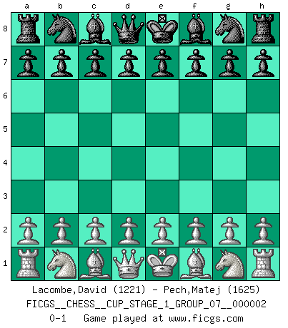 Last move : 0-1 2018 August 1 8:51:39 [Event "FICGS__CHESS__CUP_STAGE_1_GROUP_07__000002"] [Site "FICGS"] [Date "2018.07.02"] [Round "1"] [White "Lacombe,David"] [Black "Pech,Matej"] [Result "0-1"] [WhiteElo "1221"] [BlackElo "1625"] 0-1 This chess game has been lost on time (started : 2018.07.02 2:46:16) Player Black won this chess game. Follow this game move after move (download)I won't play with you anymore. You have insulted my friend. - When an opponent cursed himself for a blunder. (Miguel Najdorf) Es tut gut, die Entwicklungsperiode von, [...] demokratischem Geist durchdringen zu lassen. Wie undemokratisch wäre es doch beispielsweise, den einen Offizier große Spaziertouren vornehmen zu lassen, während die anderen zu Hause säßen und sich entsetzlich langweilten. (Aaron Nimzowitsch) Si el Ajedrez es una ciencia, es la mas inexacta. Si el Ajedrez es un arte, es demasiado inexacto para ser visto como tal. Si el Ajedrez es un deporte, es demasiado esotérico. Si el Ajedrez es un juego, es demasiado exigente para ser solo un juego. Si el Ajedrez es una aventura, es una muy demandante. Si el Ajedrez es una pasión, es una muy gratificante. Si el Ajedrez es la vida, es una muy triste. (Anónimo) Vous m'avez demandé de vous exposer quel est le fondement de la prière. Je ne fais que préparer les pièces du jeu sur la table... Nous sera-t-il permis d'en adopter les règles et si nous les appliquons scrupuleusement nous ne tarderons pas à faire mat le Roi divin ! Il ne pourra échapper à nos mains. (Sainte Thérèse d'Avila, Chemin de perfection) If passion drives you, let reason holds the reins. (Benjamin Franklin)