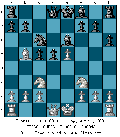 Last move : 0-1 2007 August 19 4:22:59 [Event "FICGS__CHESS__CLASS_C__000043"] [Site "FICGS"] [Date "2007.05.12"] [Round "1"] [White "Flores,Luis"] [Black "King,Kevin"] [Result "0-1"] [WhiteElo "1680"] [BlackElo "1669"] 1.d4 Nf6 2.Bg5 e6 3.e4 h6 4.Bxf6 Qxf6 5.Nc3 c5 6.e5 Qd8 7.d5 d6 8.dxe6 Bxe6 9.Nf3 d5 10.Bb5+ Nc6 0-1 This chess game has been lost on time (started : 2007.05.12 21:50:33) Trompowsky attack (Ruth, Opovcensky Opening) Player Black won this chess game. Follow this game move after move (download)All that matters on the Chessboard is good moves. (Bobby Fischer) Im Blitz ist es einfacher mit einer Figur weniger anzugreifen, als sich mit einer Mehrfigur zu verteidigen. (Mikhail Nekhemyevich Tal) En partidas rápidas, el Caballo es mas poderoso que el Alfil. (Vlastimil Hort) C'est une question de caractère, Beaucoup de gens perdent leur motivation très vite. D'autres, ils sont rares, peuvent la conserver très longtemps. J'aime les échecs, encore aujourd'hui je suis heureux d'analyser des parties. J'aime toujours gagner, je déteste encore perdre. Bien jouer est important pour mon intégrité intellectuelle et morale. Et puis les échecs vivent en ce moment une période historique grâce à Internet. Ils se développent dans les systèmes éducatifs à travers le monde. Ils sortent de leur ghetto, et c'est mon rôle de mener à bien cette révolution. (Gary Kasparov) Perception is reality. (Immanuel Kant)