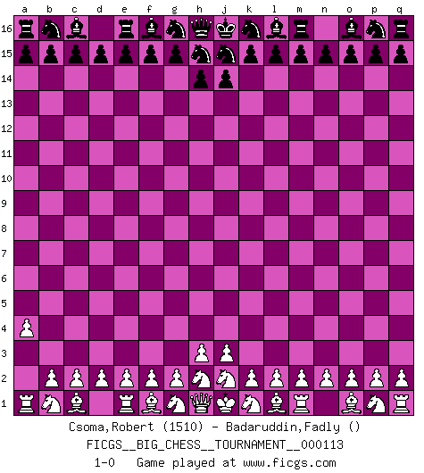 Last move : 1-0 2018 August 1 20:56:17 [Event "FICGS__BIG_CHESS__TOURNAMENT__000113"] [Site "FICGS"] [Date "2018.07.02"] [Round "1"] [White "Csoma,Robert"] [Black "Badaruddin,Fadly"] [Result "1-0"] [WhiteElo "1510"] [BlackElo ""] 1.a2-a4 1-0 This big chess game has been lost on time (started : 2018.07.02 10:24:23) Follow this game move after move (download)What is the object of playing a gambit opening?... To acquire a reputation of being a dashing player at the cost of losing a game. (Siegbert Tarrasch) Ich suche im Schach immer etwas Eigenes. Riskantes Spiel im Stile schachlicher Musketiere ist nicht meine Sache, auch wenn es vielen Freunden scharfer Wendungen gefällt. (Anatoly Karpov) El Ajedrez era la lengua materna de Capablanca. (Reti) Donnez-moi un Cavalier en 6e et je gagnerais toutes mes parties. (Steinitz) A specialist learns more and more about less and less until he knows everything about nothing. (Nicholas Murray Butler)