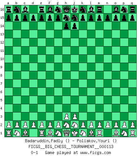 Last move : 0-1 2018 August 1 20:56:17 [Event "FICGS__BIG_CHESS__TOURNAMENT__000113"] [Site "FICGS"] [Date "2018.07.02"] [Round "1"] [White "Badaruddin,Fadly"] [Black "Poliakov,Youri"] [Result "0-1"] [WhiteElo ""] [BlackElo ""] 0-1 This big chess game has been lost on time (started : 2018.07.02 10:24:23) Follow this game move after move (download)Chess problems demand from the composer the same virtues that characterize all worthwhile art: originality, invention, conciseness, harmony, complexity, and splendid insincerity. (Vladimir Nabokov) Unter Putin wird alles Geld aus Russland wie von einem Staubsauger nach Moskau umgeleitet, das ist wie ein schwarzes Loch. (Garry Kasparov) El Ajedrez es una manera fabulosa para que los niños aprendan a autovalorarse y a autoestimarse. (Saudin Robovic) Même un GMI sait rarement calculer sur plus de cinq coups une attaque à sacrifices. (Rudolf Spielmann) Luck never made a man wise. (Seneca, Letters to Lucilius)
