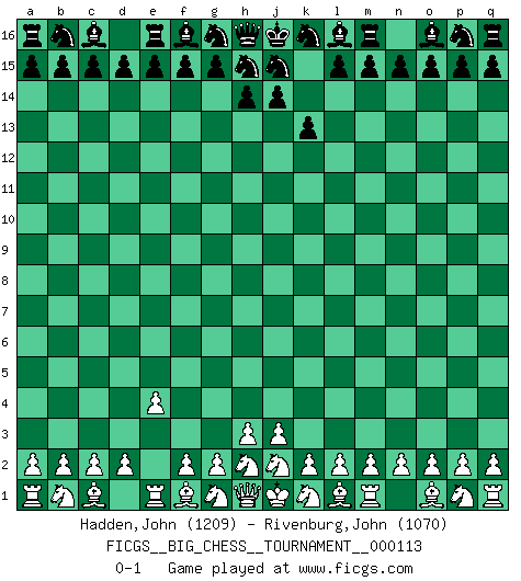 Last move : 0-1 2018 July 5 22:28:7 [Event "FICGS__BIG_CHESS__TOURNAMENT__000113"] [Site "FICGS"] [Date "2018.07.02"] [Round "1"] [White "Hadden,John"] [Black "Rivenburg,John"] [Result "0-1"] [WhiteElo "1209"] [BlackElo "1070"] 1.e2-e4 k15-k13 0-1 Follow this game move after move (download)When you are lonely, when you feel yourself an alien in the world, play Chess. This will raise your spirits and be your counselor in war. (Aristotle) Wenn Du einsam bist, wenn Du Dich in der Welt wie ein Fremder fühlst, spiele Schach. Das wird Deinen Geist erheben und Dein Ratgeber im Kampf sein. (Aristoteles) ¿Porque tengo que perder ante este idiota?. (Aron Nimzovich) Le thème de l'attaque double intervient d'une manière ou d'une autre dans l'immense majorité des combinaisons. (Youri Averbakh) Humor is by far the most significant activity of the human brain. (Edward De Bono)