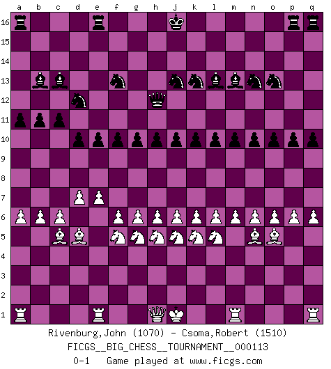 Last move : 0-1 2018 December 26 15:33:10 [Event "FICGS__BIG_CHESS__TOURNAMENT__000113"] [Site "FICGS"] [Date "2018.07.02"] [Round "1"] [White "Rivenburg,John"] [Black "Csoma,Robert"] [Result "0-1"] [WhiteElo "1070"] [BlackElo "1510"] 1.g2-g4 q15-q13 2.k2-k4 p15-p13 3.h1-e4 n15-n14 4.h3-h4 o15-o13 5.j3-j4 p16-q14 6.e2-e3 n14-n13 7.l2-l3 m15-m13 8.f2-f3 l15-l13 9.m2-m3 k15-k13 10.n2-n3 j14-j13 11.m3-m4 h14-h13 12.p2-p3 g15-g13 13.f3-f4 f15-f13 14.b2-b4 e15-e13 15.l3-l4 d15-d13 16.e4-f3 c15-c13 17.n3-n4 b15-b13 18.a2-a4 a15-a13 19.o2-o4 o16-n15 20.c2-c4 k16-l14 21.e3-e4 c16-d15 22.d2-d4 l16-n14 23.q2-q4 g16-h14 24.p3-p4 f16-d14 25.b1-d2 h16-f14 26.g1-h3 q13-q12 27.j2-g3 p13-p12 28.k1-j3 o13-o12 29.h2-k3 n13-n12 30.p1-n2 m13-m12 31.n2-l3 l13-l12 32.f3-h1 k13-k12 33.d2-f3 j13-j12 34.f1-d3 h13-h12 35.c1-e3 g13-g12 36.l1-n3 f13-f12 37.o1-m3 e13-e12 38.h4-h5 d13-d12 39.g4-g5 c13-c12 40.f4-f5 b13-b12 41.e4-e5 a13-a12 42.d4-d5 q14-o13 43.c4-c5 n14-m13 44.b4-b5 n15-l13 45.d3-c4 l14-n13 46.a4-a5 j15-k13 47.j4-j5 h15-j13 48.o4-o5 h14-f13 49.n4-n5 d14-c13 50.n3-o4 d15-b13 51.p4-p5 b16-c14 52.q4-q5 m16-p16 53.m4-m5 q12-q11 54.l4-l5 p12-p11 55.k4-k5 o12-o11 56.o5-o6 n12-n11 57.p5-p6 m12-m11 58.q5-q6 l12-l11 59.m3-o5 k12-k11 60.n5-n6 g12-g11 61.m5-m6 j12-j11 62.o4-n5 h12-h11 63.l5-l6 f12-f11 64.k5-k6 e12-e11 65.k3-l5 d12-d11 66.l3-k5 c12-c11 67.j5-j6 b12-b11 68.h5-h6 a12-a11 69.h3-j5 c14-d12 70.j3-h5 f14-h12 71.g5-g6 q11-q10 72.f3-g5 p11-p10 73.f5-f6 e11-e10 74.g3-f5 o11-o10 75.e5-e6 n11-n10 76.d5-d6 m11-m10 77.c4-d5 l11-l10 78.c5-c6 k11-k10 79.e3-c5 j11-j10 80.b5-b6 h11-h10 81.a5-a6 g11-g10 82.e6-e7 f11-f10 83.d6-d7 d11-d10 0-1 This big chess game has been lost on time (started : 2018.07.02 10:24:23) Follow this game move after move (download)Help your pieces so they can help you. (Paul Morphy) Kritik überlasse ich den Spießern. Ich zeige nichts, wofür ich mich schämen muss. (Alexandra Kosteniuk) Cuando tengas duda... ¡juega al Ajedrez!. (Tevis) Des points faibles ou des trous dans la position de l'adversaire doivent être occupés par des pièces et non pas par des pions. (Siegbert Tarrasch) All politicians must be presumed guilty until they are proven innocent. (Dinesh De Silva)